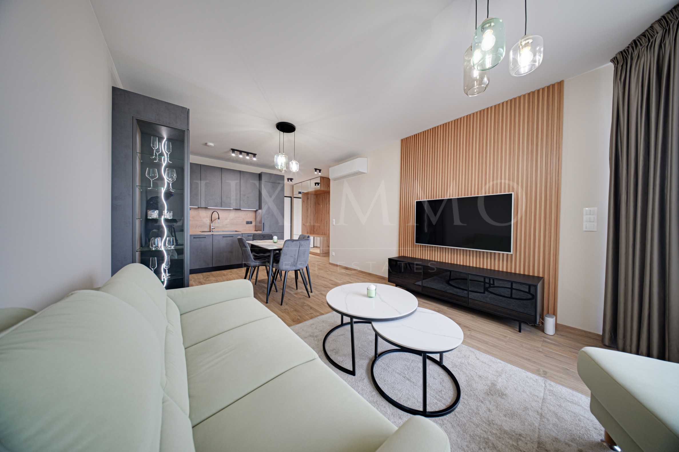 Представяме просторен, първокласно мебелиран двустаен апартамент за под наем, в нова, модерна сграда в столицата.