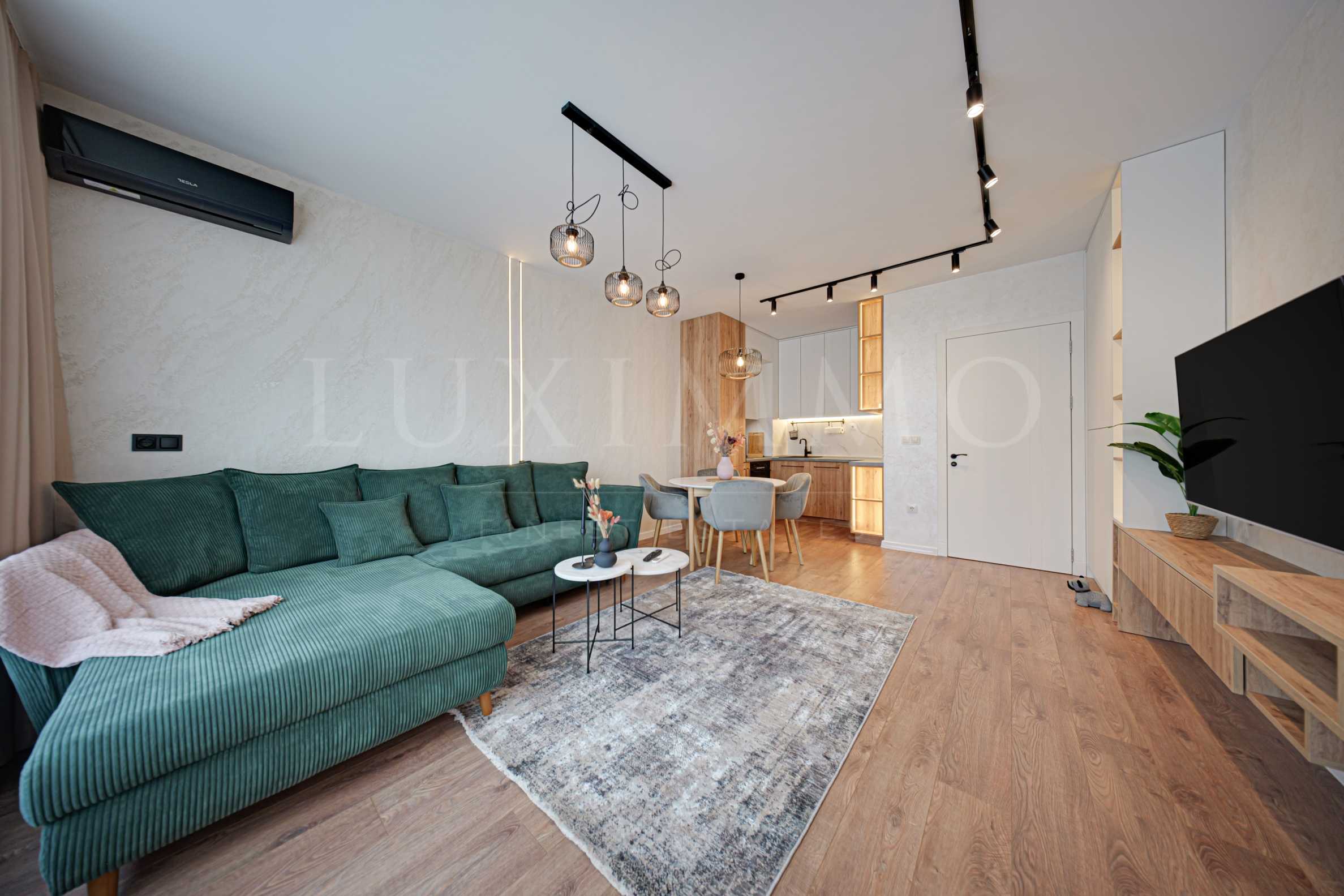 - Дневна: ъглов диван с лежанка, две холни маси, LCD - 55' smart LG, трапезарна маса с 4 стола, климатик Tesla с wi-fi;
