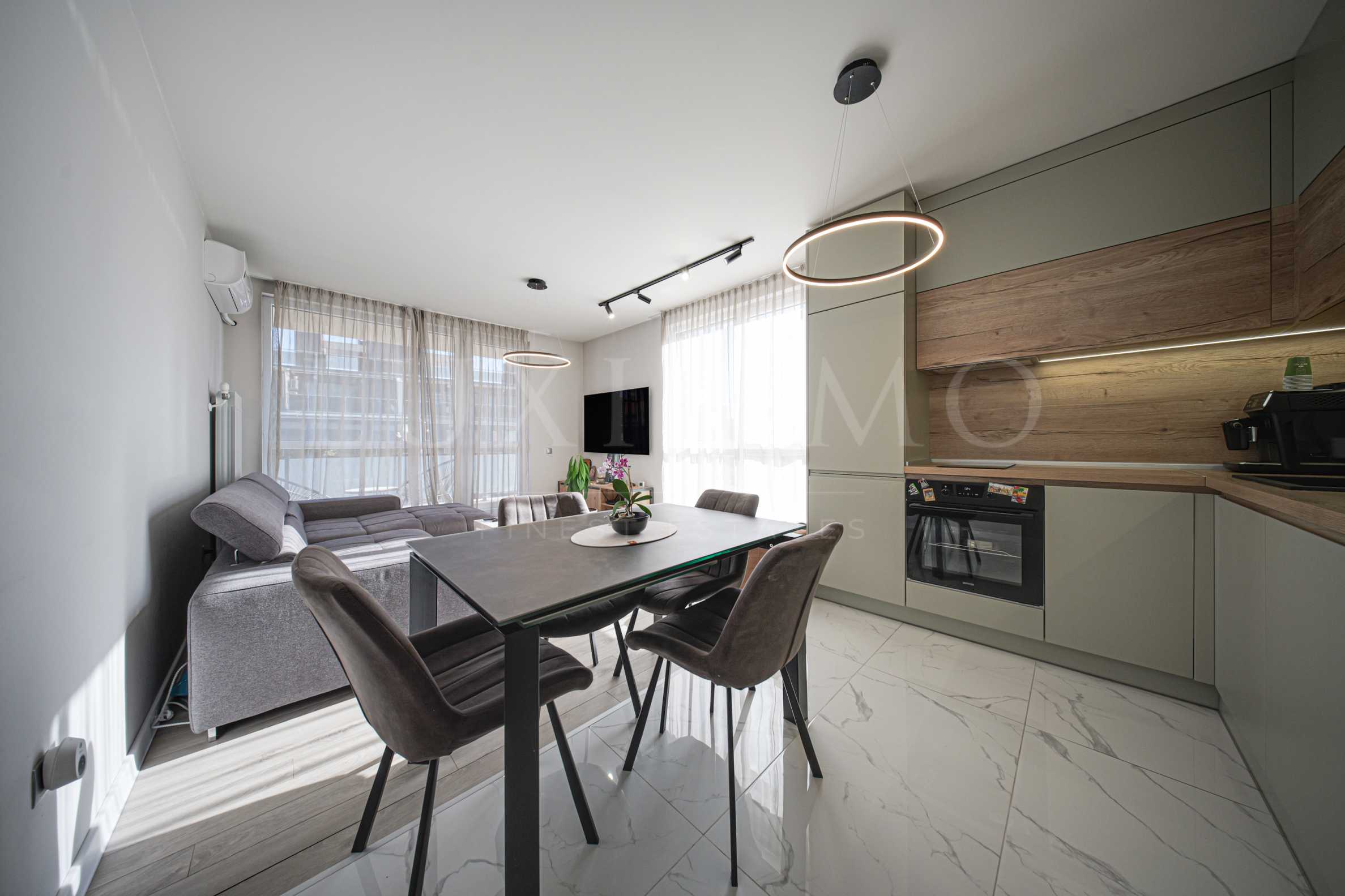 Всекидневната е светла, обзаведена с удобен диван и стилна холна маса, идеални за почивка. Кухненският бокс е оборудван с елегантни шкафове с минималистичен дизайн, създаващи усещане за лекота и изтънченост.