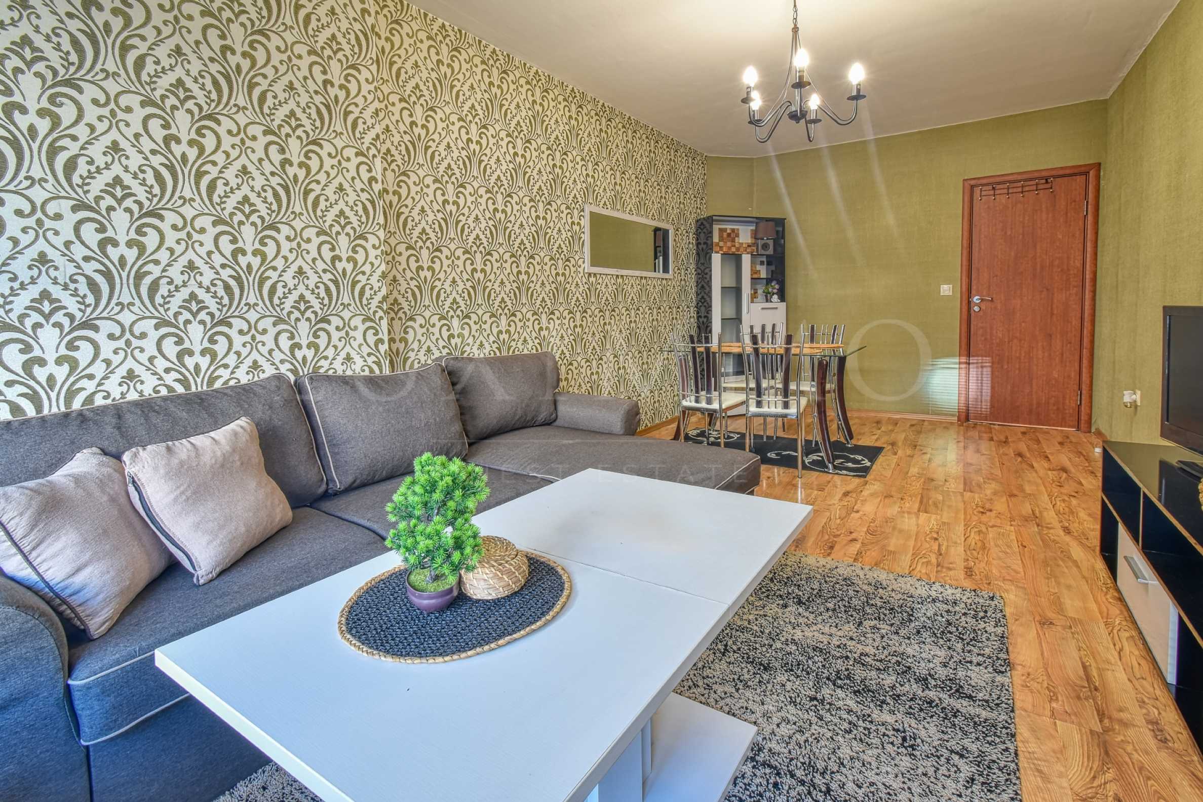 Апартаментът впечатлява с уютна атмосфера и обзавеждане. Просторният хол е декориран с внимание към детайла, съчетавайки комфортна мека мебел, холна секция, маса за хранене и телевизор, като създава не само уют, но и чувство за стил и естетика. Спалнята е обзаведена с гардероб, скрин и спалня, а оригиналните дизайнерски акценти допринасят за неповторимия ѝ чар.Просторната терасата осигурява приятно място за отдих на открито.