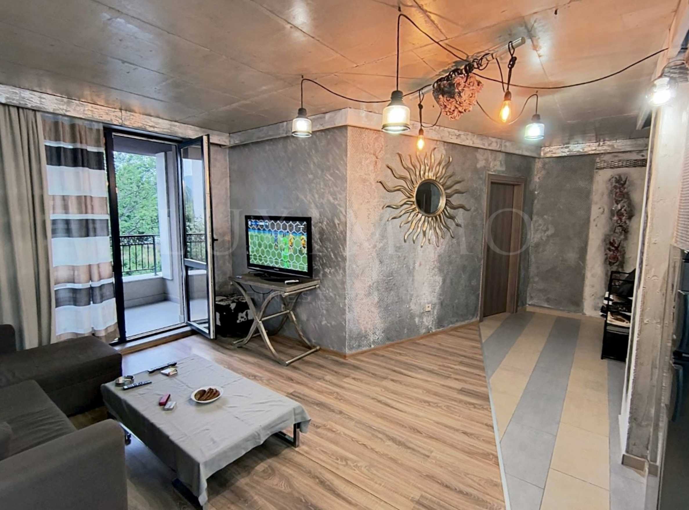 Интериорът на апартамента е внимателно подбран и съчетава интересни модерни елементи. Цветовата палитра създава приятна и спокойна атмосфера.