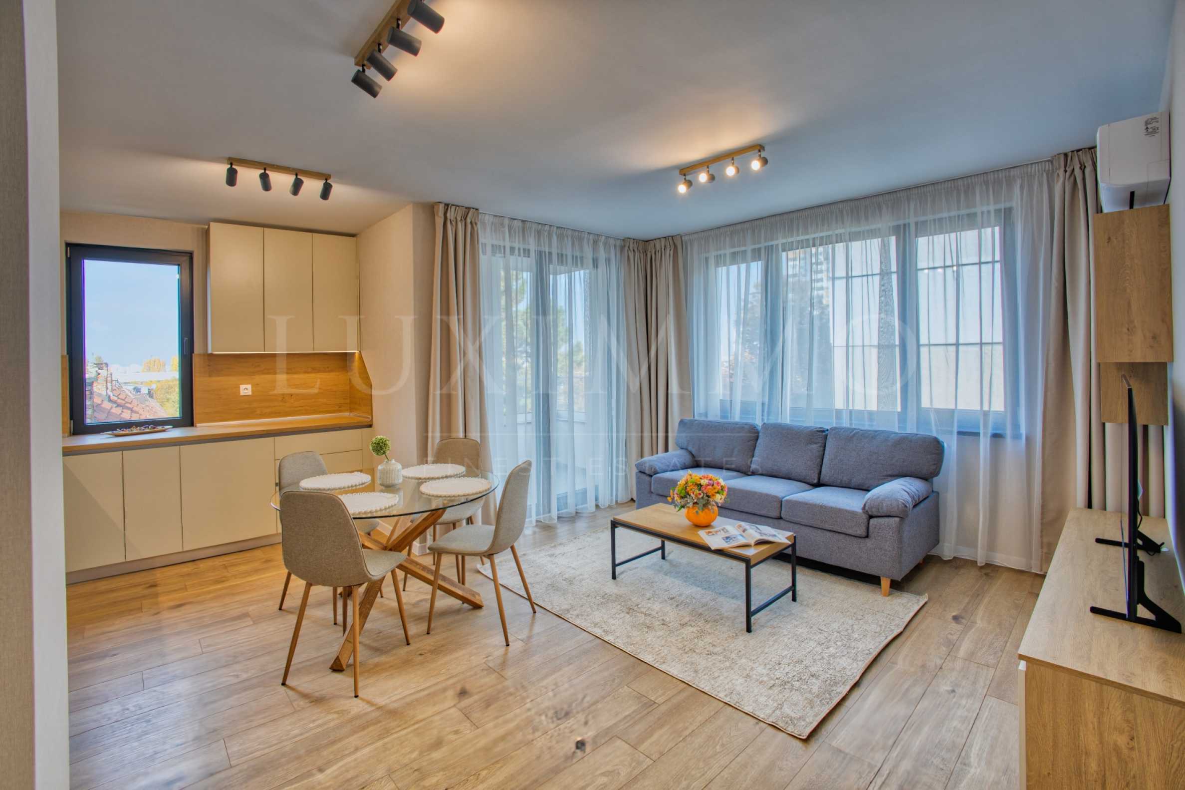 Апартаментът е напълно обзаведен с нови мебели и висок клас електроуреди, като е оборудван с всичко необходимо за комфортно и спокойно ежедневие. Завършен с функционални интериорни решения, той предлага усещане за простор и уют във всяко помещение.