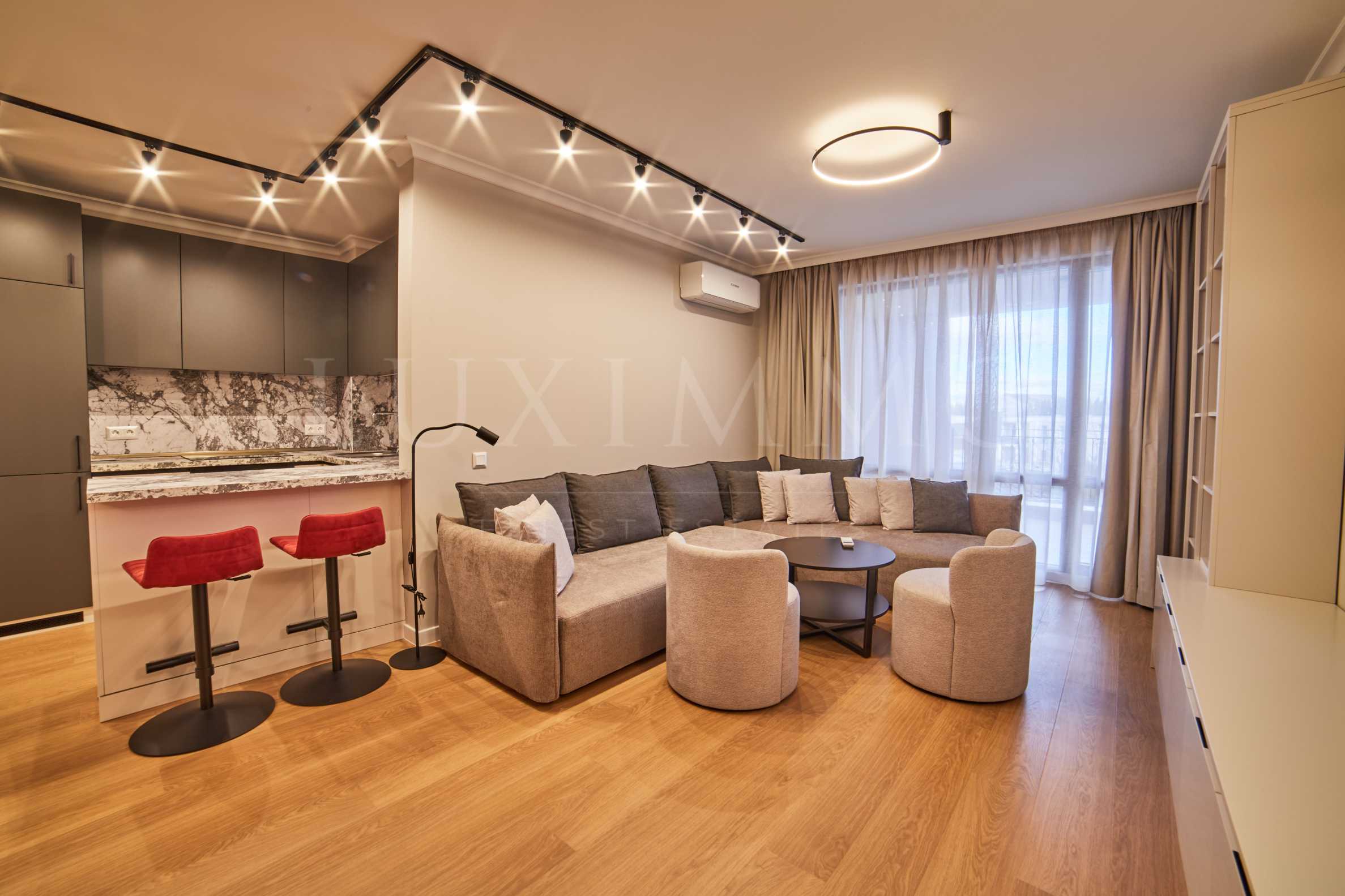 Апартаментът е напълно обзаведен с нови висококачествени мебели и последно поколение електроуреди, осигурявайки комфортно и спокойно ежедневие. Жилището се намира на трети жилищен етаж с гледки към града, а сградата разполага с луксозен асансьор и отлични общи части. В наемната цена е включена такса поддръжка на стойност 150 евро, която покрива разходите по общи части, озеленяване, охрана и видеонаблюдение.