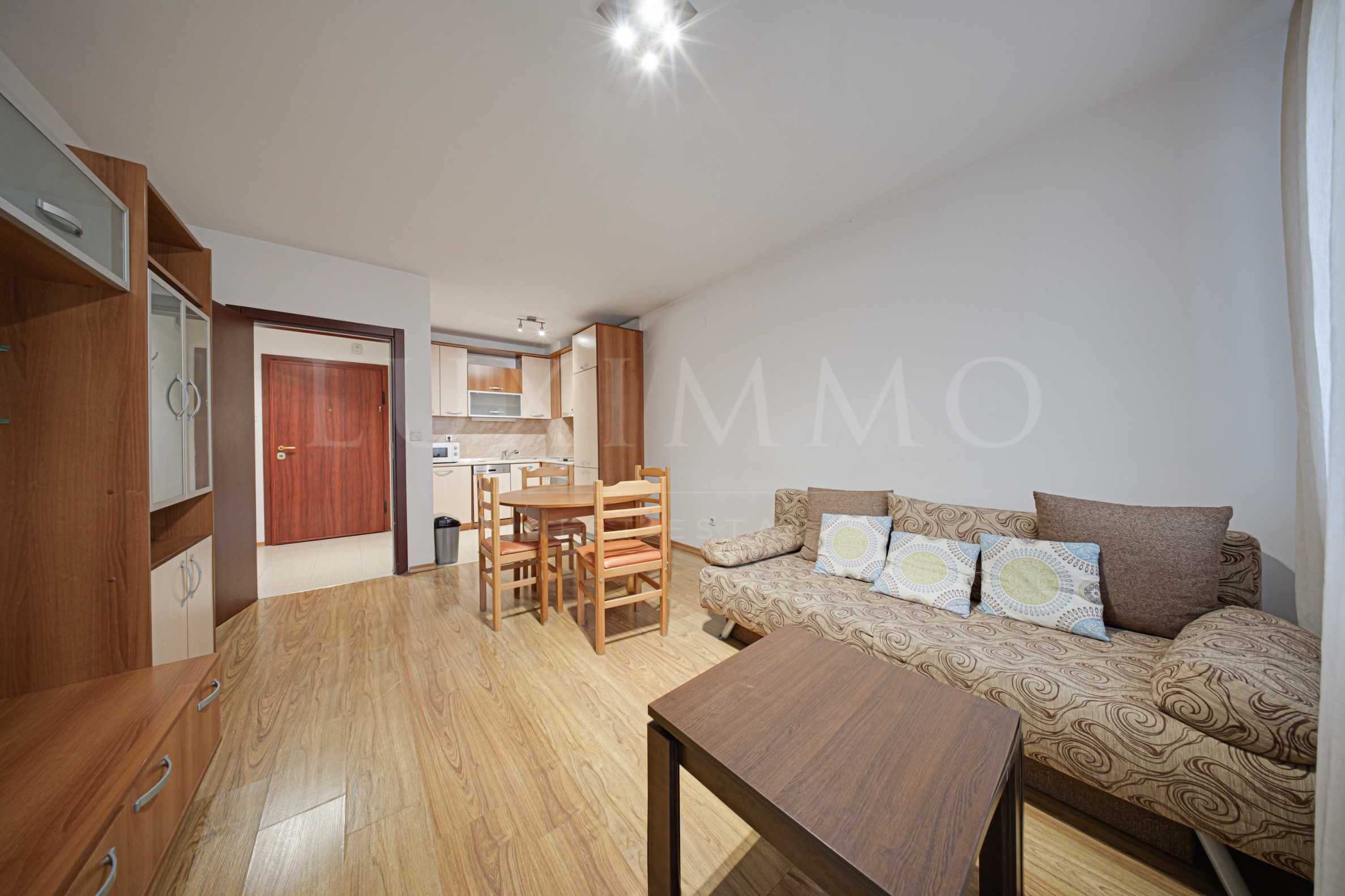- Светла дневна с кухненски бокс, обзаведена с удобна мека мебел и трапезна зона;