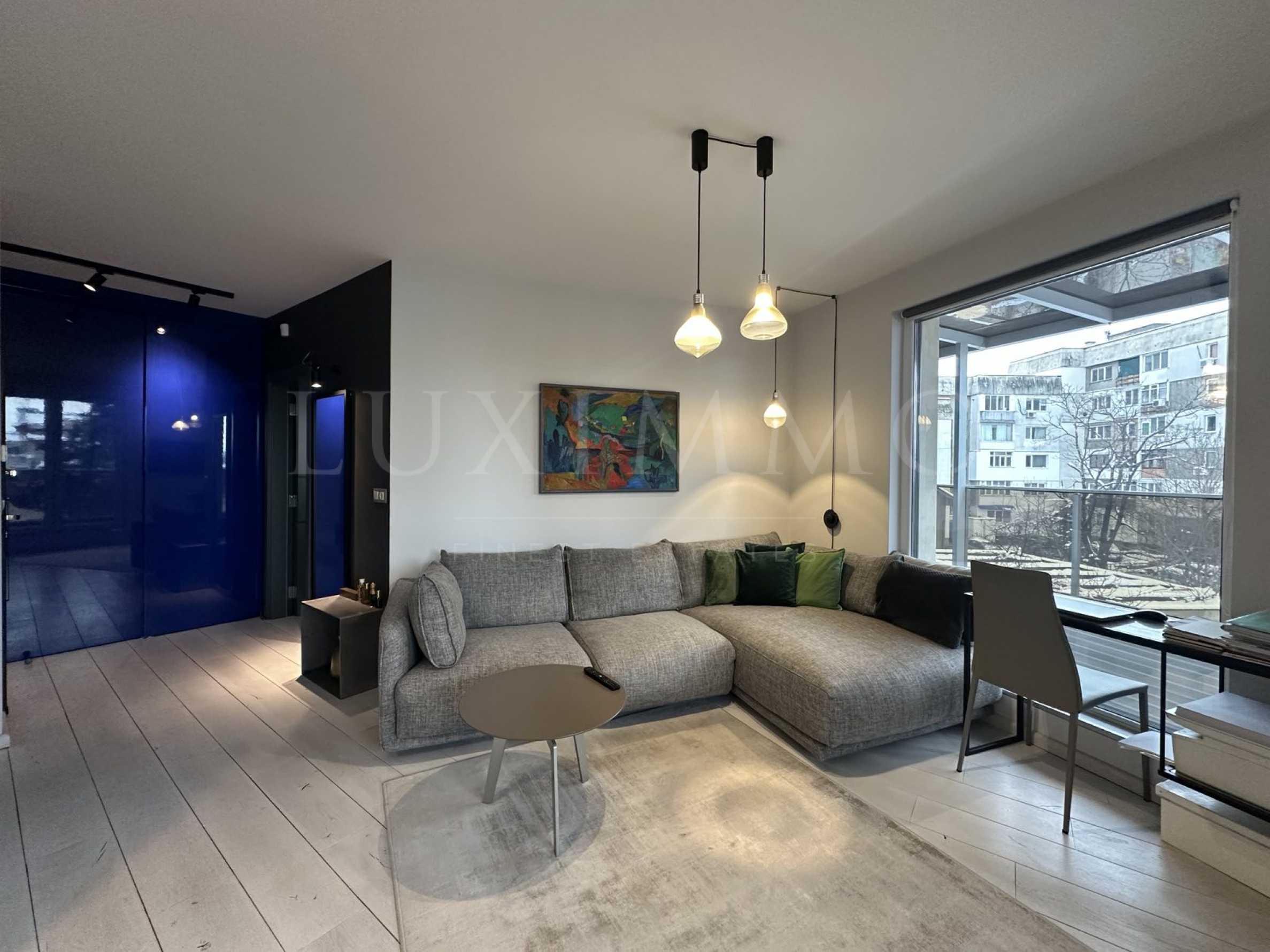 Апартаментът е завършен с висококачествени материали по дизайнерски проект, подът е от масивен паркет - дъб, електроуредите са SMEG, а всички мебели в имота са италиански.