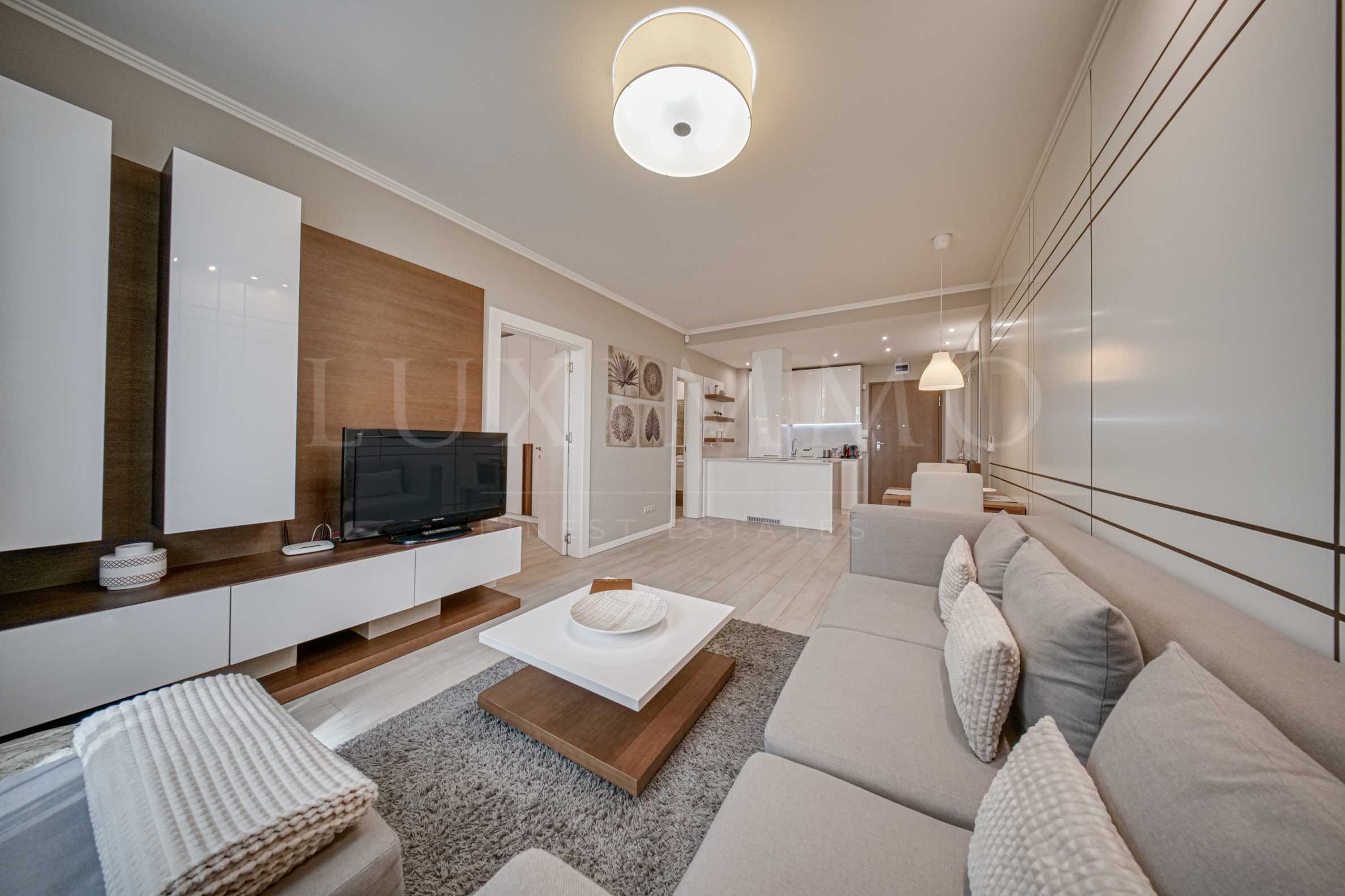 Още от входа ще усетите топлината и хармонията на интериора, решен в мека бежова гама. Просторната дневна е залята от естествена светлина и Ви кани да се отпуснете в удобната мека мебел след динамичен ден.
