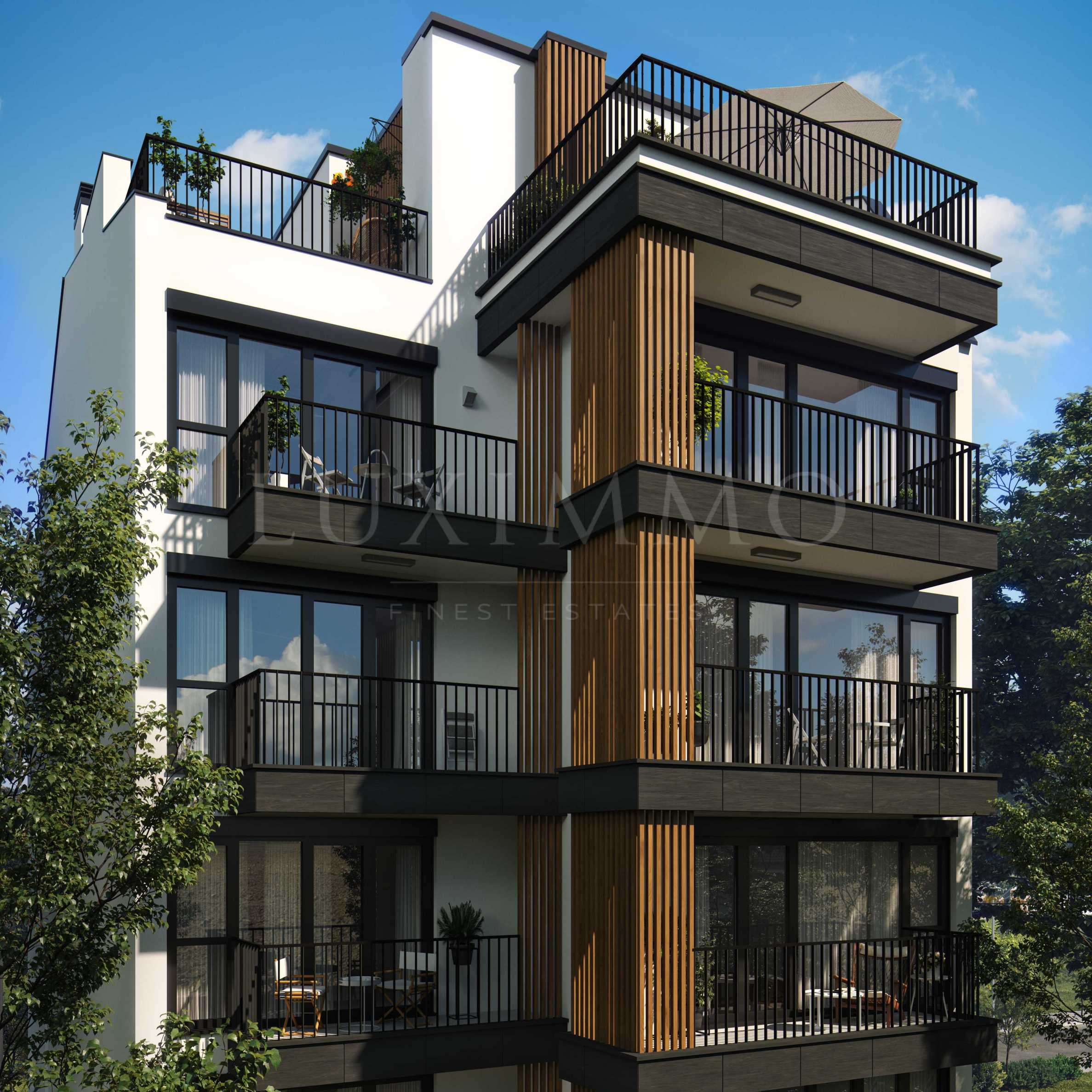 Сградата впечатлява с архитектура, която съчетава съвременен дизайн, прецизна детайлност и материали от най-висок клас. Линиите са чисти и елегантни, а цялостната визия носи усещане за динамика, стил и градски лукс. Фасадата е проектирана с вентилируема система, широкоформатни керамични плочи и структурна мазилка, подбрани заради тяхната издръжливост, естетика и енергийна ефективност. Тези премиум решения не само подчертават модерния характер на сградата, но и гарантират дългогодишна устойчивост и безупречен външен вид. Архитектурните акценти и внимателно подбраните материали създават хармонична композиция, която превръща проекта в отличителен и престижен дом – истински еталон за градско строителство от висок клас.
