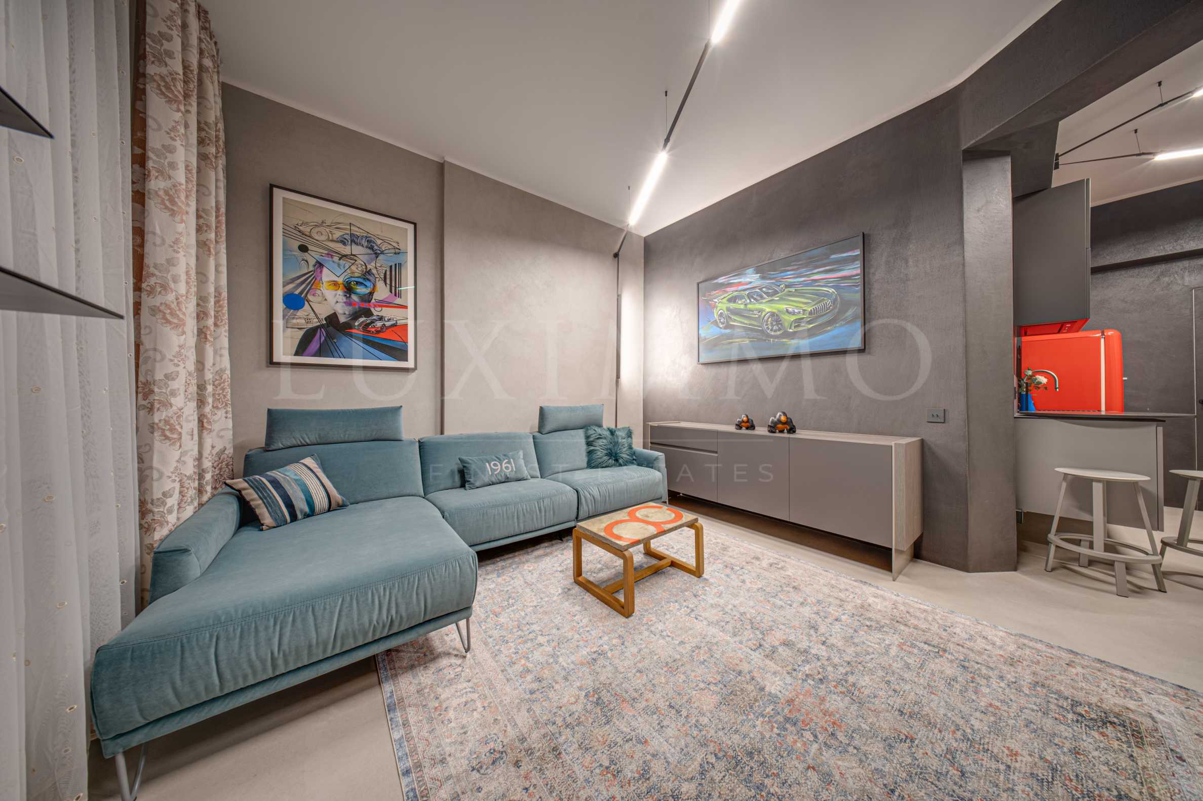 Обзавеждането е селектирано с внимание към комфорта и визуалната цялост — диван Gautier с електрическа функция, дизайнерски шкаф в дневната, ретро хладилник Smeg, копринен килим и специално изработена плъзгаща врата за спалнята.