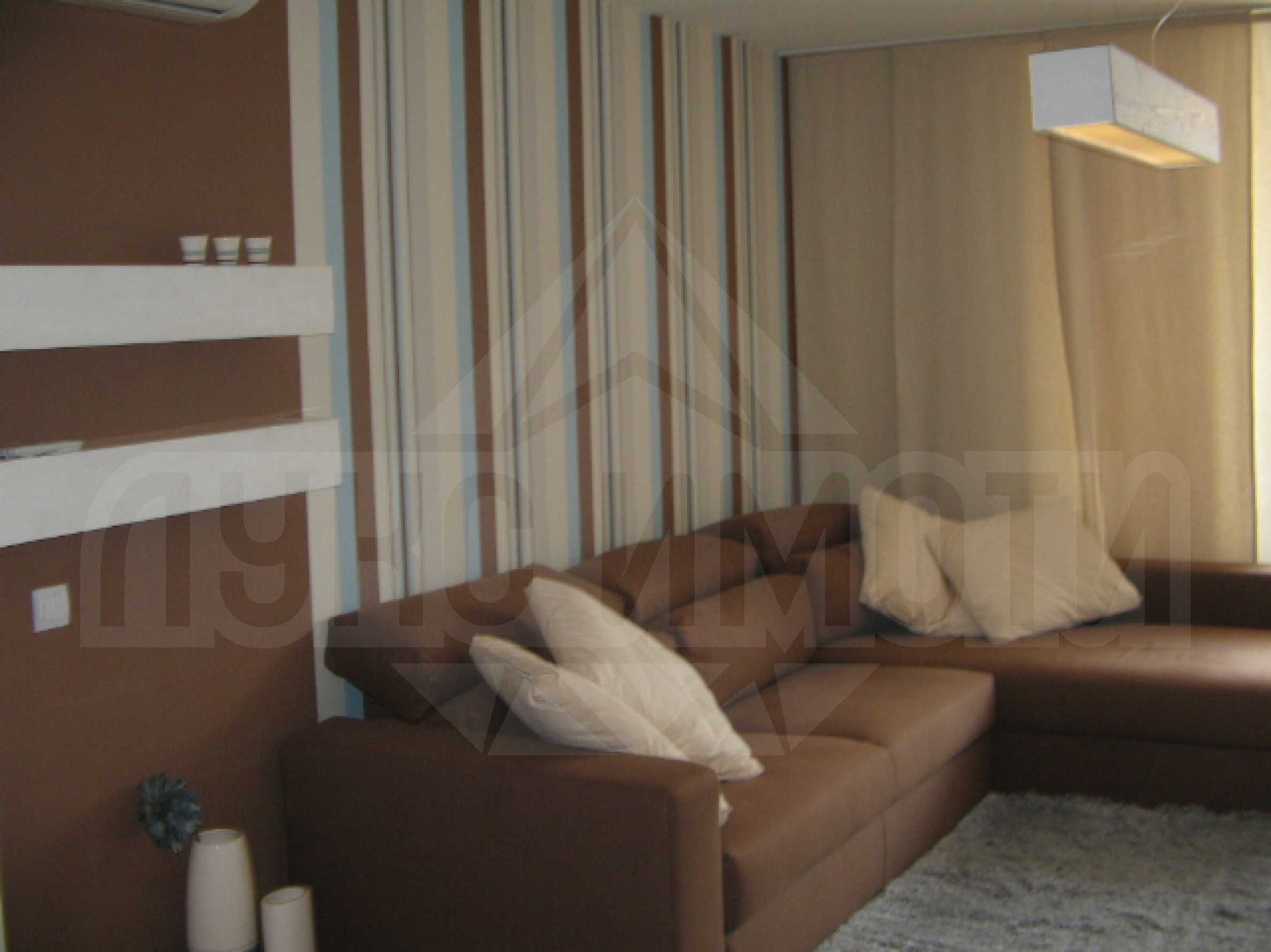 Дневната е светла, слънчева и просторна, с голям диван и удобни кресла, телевизор с широк LCD екран, съвременни осветителни тела и стилна трапезария. Хубав паркет от масивно дърво покрива подовете в по-голямата част от апартамента.