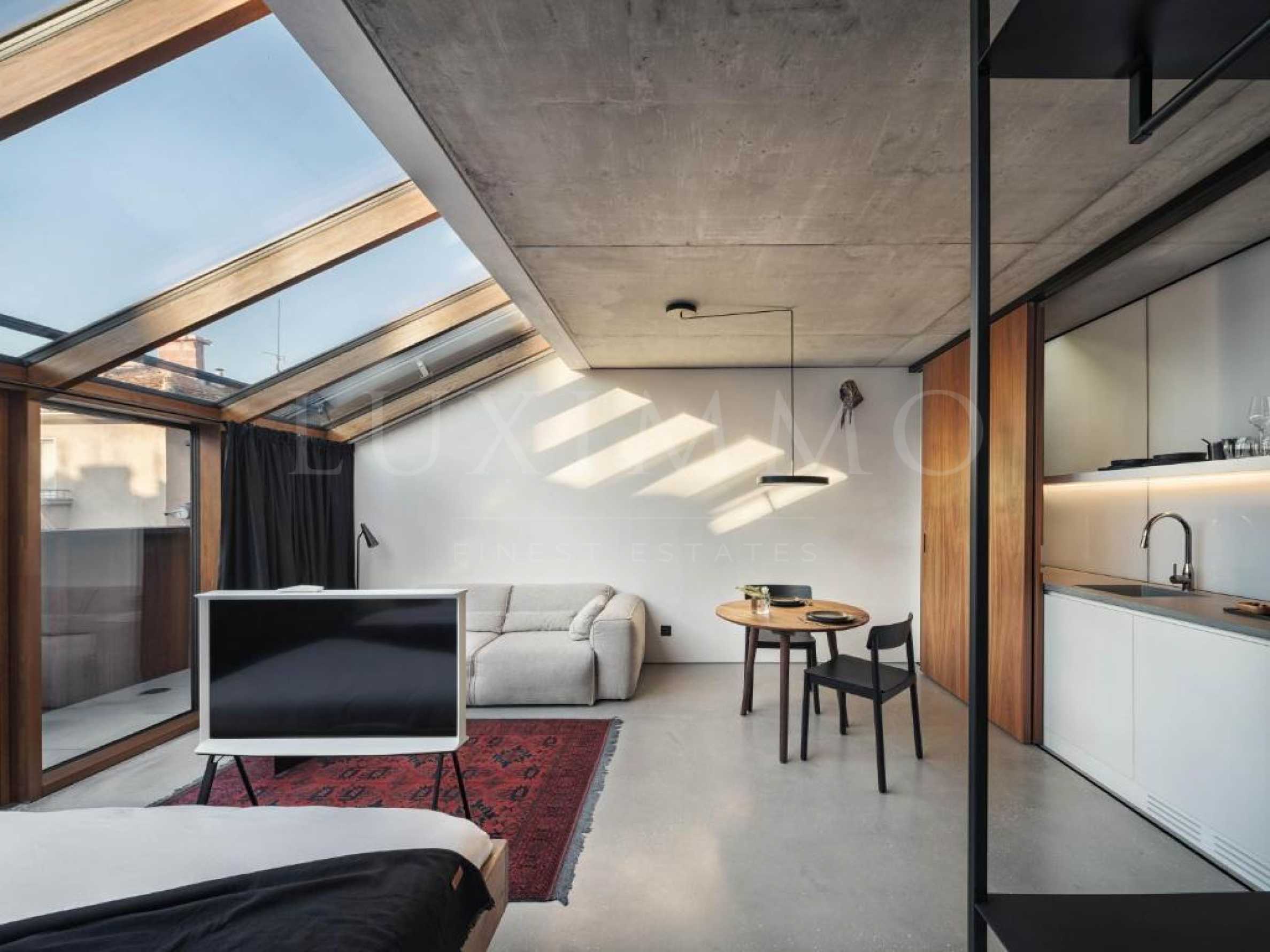 Апартаментът е разположен на 3-ти етаж и се радва на уют, светлина и отличителни детайли. Имотът предлага стъклен покрив и тераса, двойно легло и диван, кухненски бокс и трапезна маса, санитарен възел.