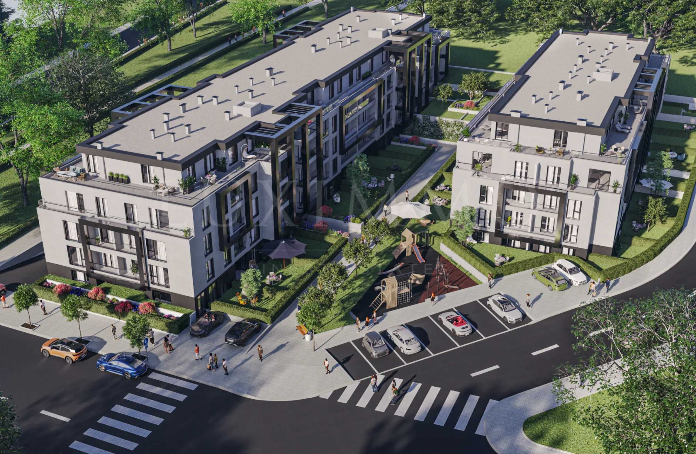 Комплексът разполага и с богато озеленена градина, която включва зони за отдих, детска площадка и обособено пространство за домашни любимци.