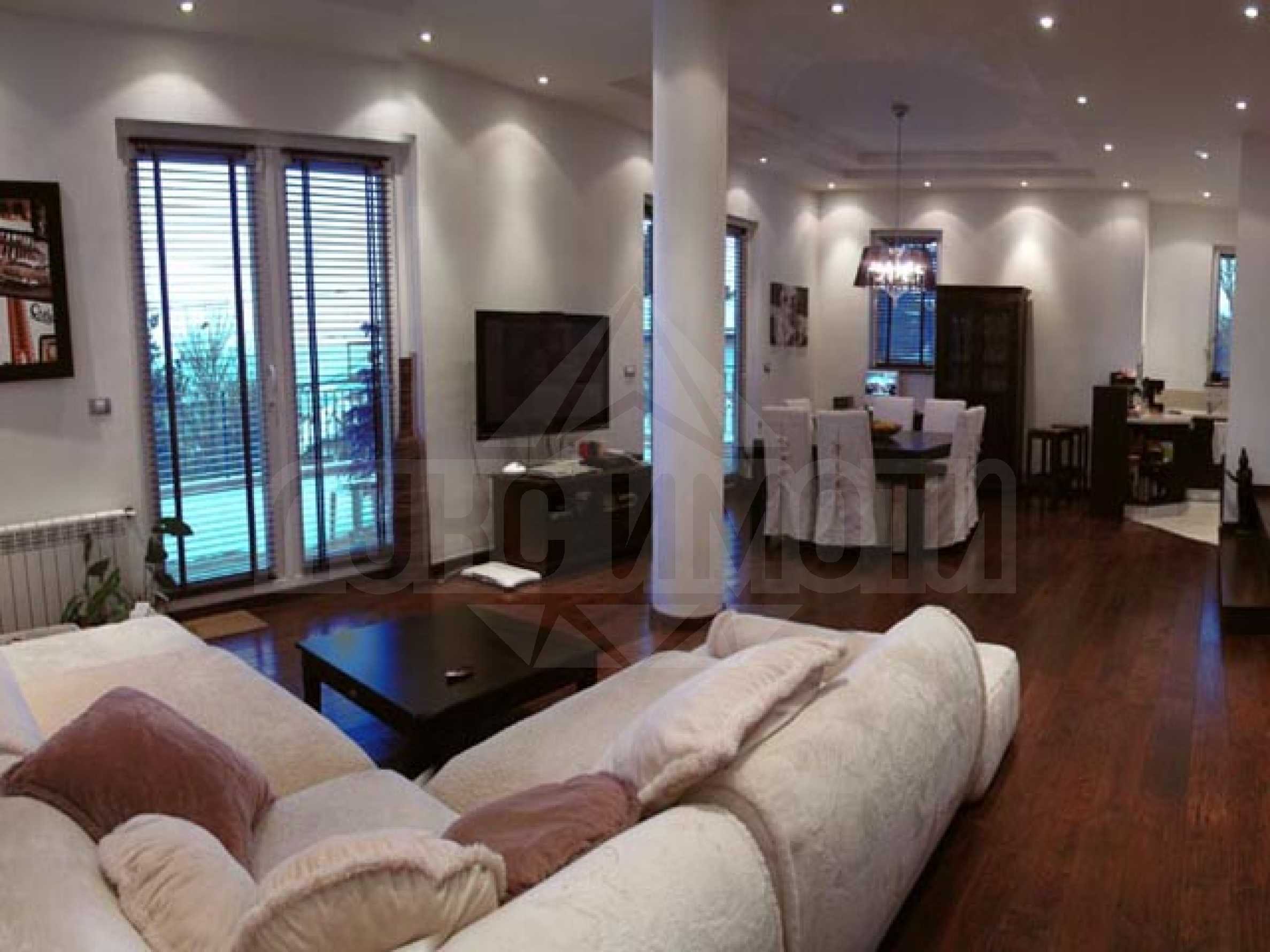 Имотът се състои от три етажа и 980 кв.м. красиво озеленено дворно място. Изложението е север/юг- с прекрасни панорамни гледки към града и планина Витоша. Характеризира се с качествени довършителни работи: