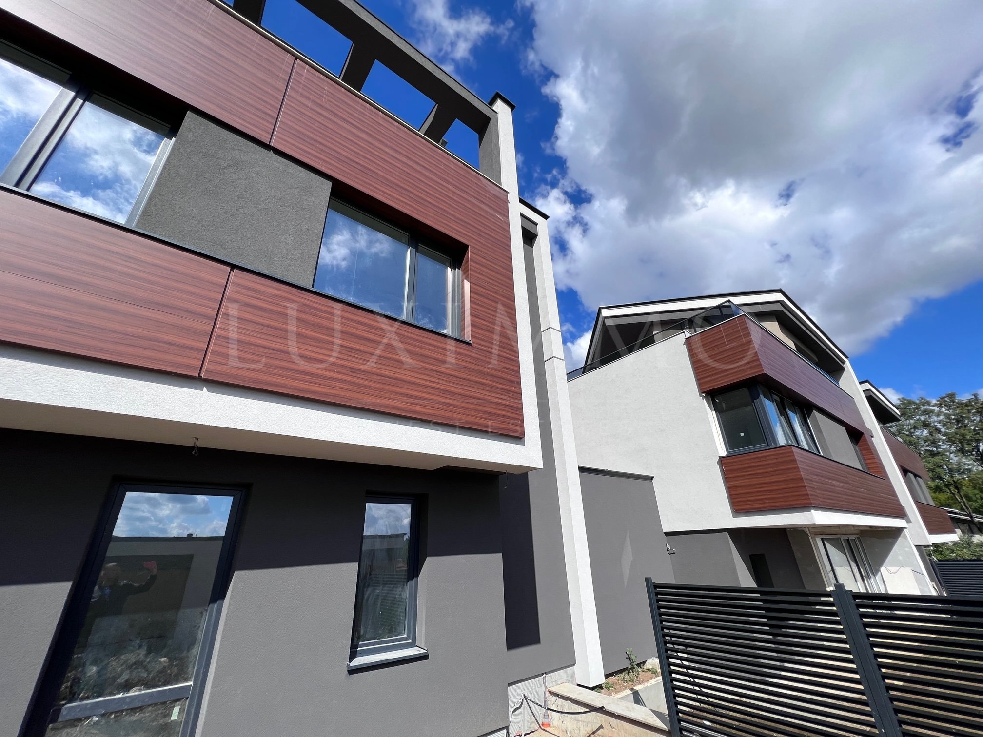 Имотът е на три етажа с изложение юг/север/запад. Разполага с голяма панорамна тераса и озеленен двор (128 кв.м) с павета и паркомясто. Предлага се на шпакловка и замазка и монтирана петкамерна PVC дограма.