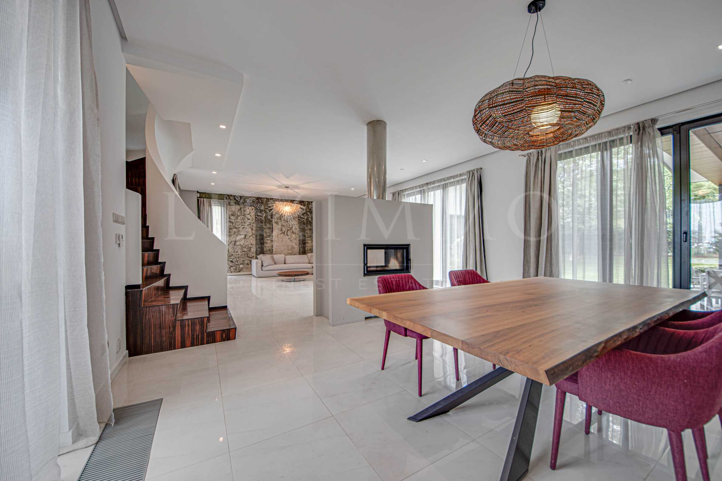 1-ви етаж: входно антре; дневна с трапезария; кухня; тоалетна за гости ; мокро помещение ;спалня за гости с баня и тоалетна; двоен гараж с директен достъп от улицата; помещение за фитнес.