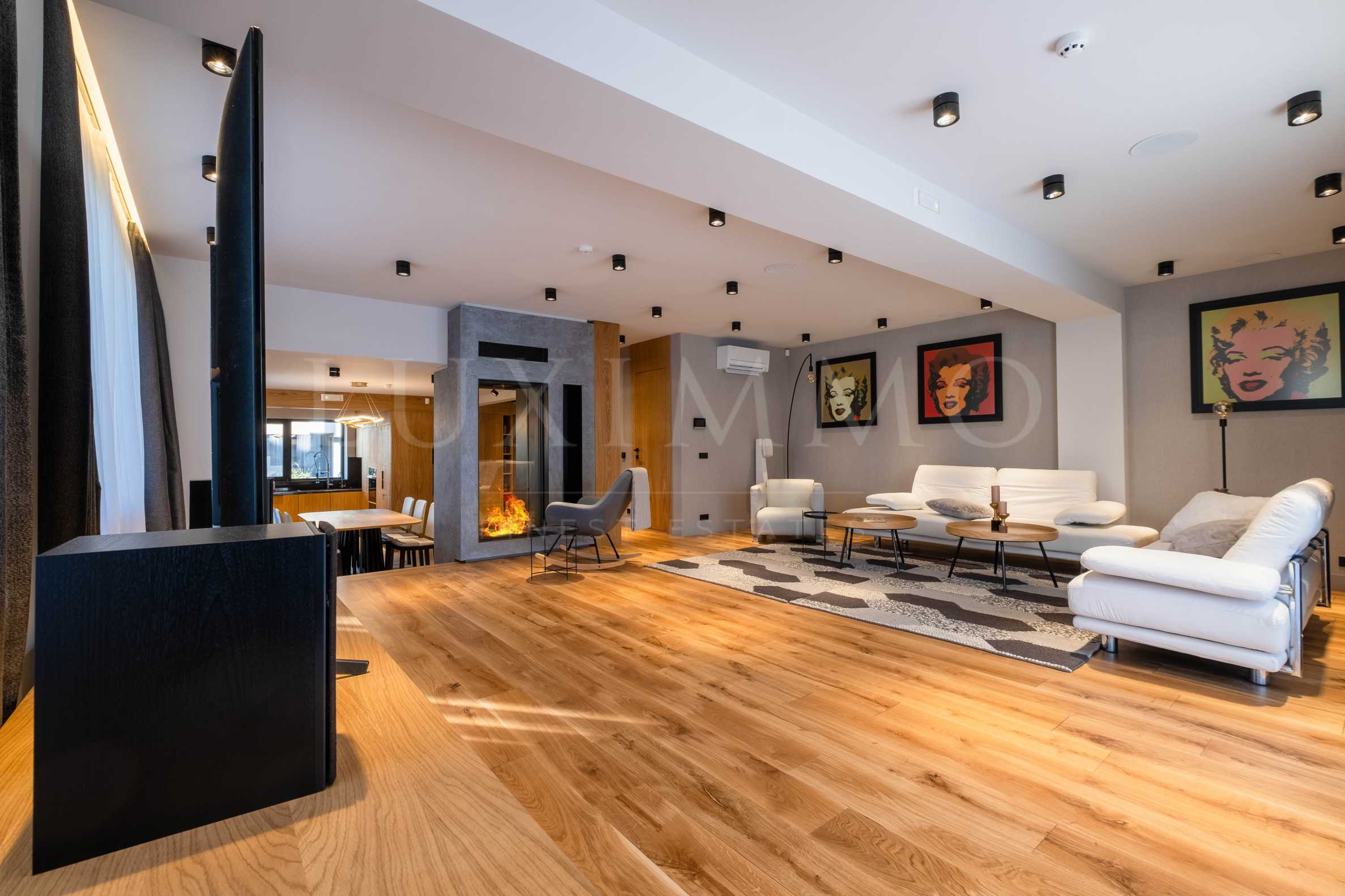 Представителният вход отвежда към прекрасна дневна, отворена към външната среда, с огромни витрини и директен излаз в градината. Пространството на дневната е разделено на две секции. Едната е за почивка, с диван, тапициран в бяла кожа на фирма безспорен лидер в обзавеждането - Rolf Benz и красива камина. В секцията за хранене е обособена напълно оборудвана кухня с електроуреди на марката Miele и дизайнерска маса за 8 човека. На този етаж къщата разполага и с тоалетна за гости.