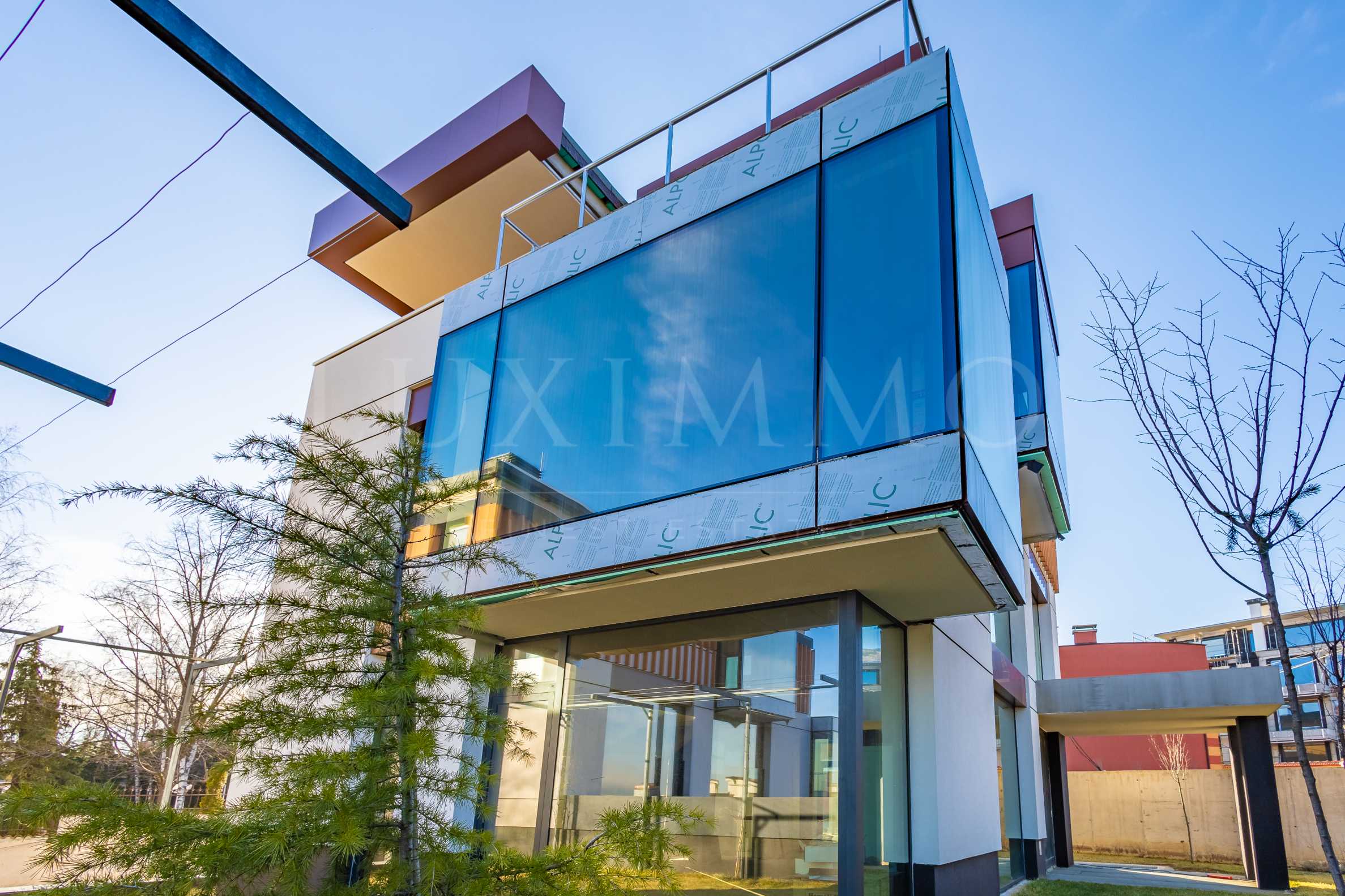 Фасадите и елементите на ландшафта в рамките на комплекса са издържани в четири основни материала – алуминиева облицовка с бронзов цвят по бордове и козирки, бяла мазилка, имитиращи дърво ламели, плочи технически порцелан с цвят антрацит и видим бетон по цоклите, цветарниците и подпорните стени.