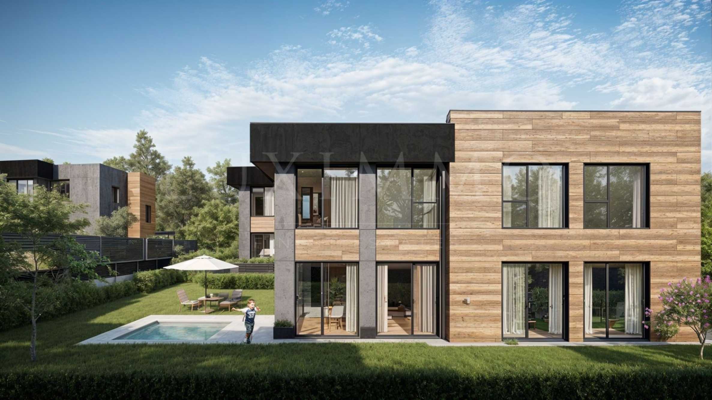 Къща 4 е с РЗП 370.2 кв.м и парцел 823 кв.м. Къщата е 2-етажна и разполага с 5 стаи, 4 спални, 3 бани, 3 паркоместа на закрито, собствен двор с ажурна ограда и собствен басейн.