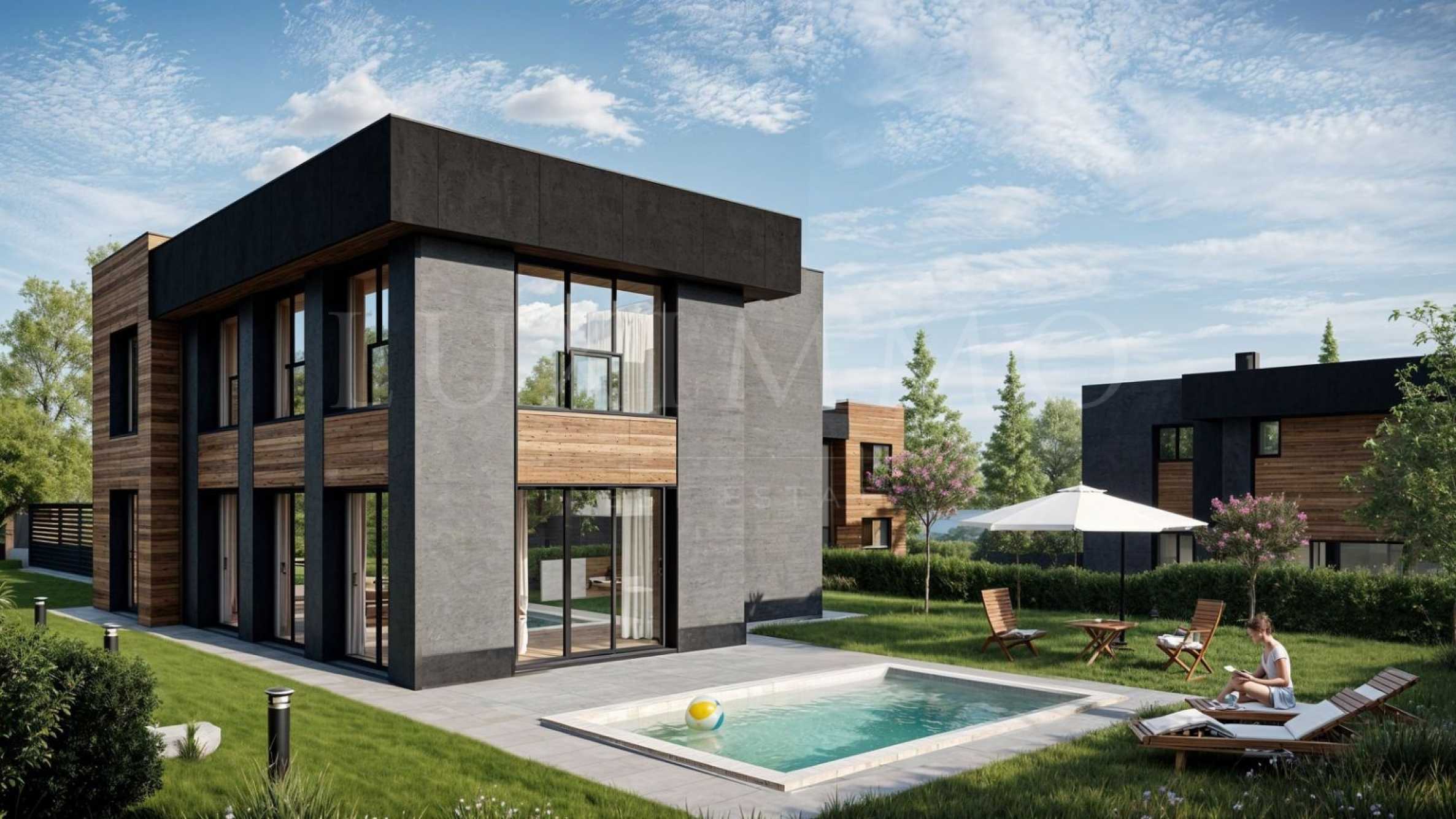 Къщите се предлагат със самостоятелен двор, ажурна ограда и собствен частен басейн.