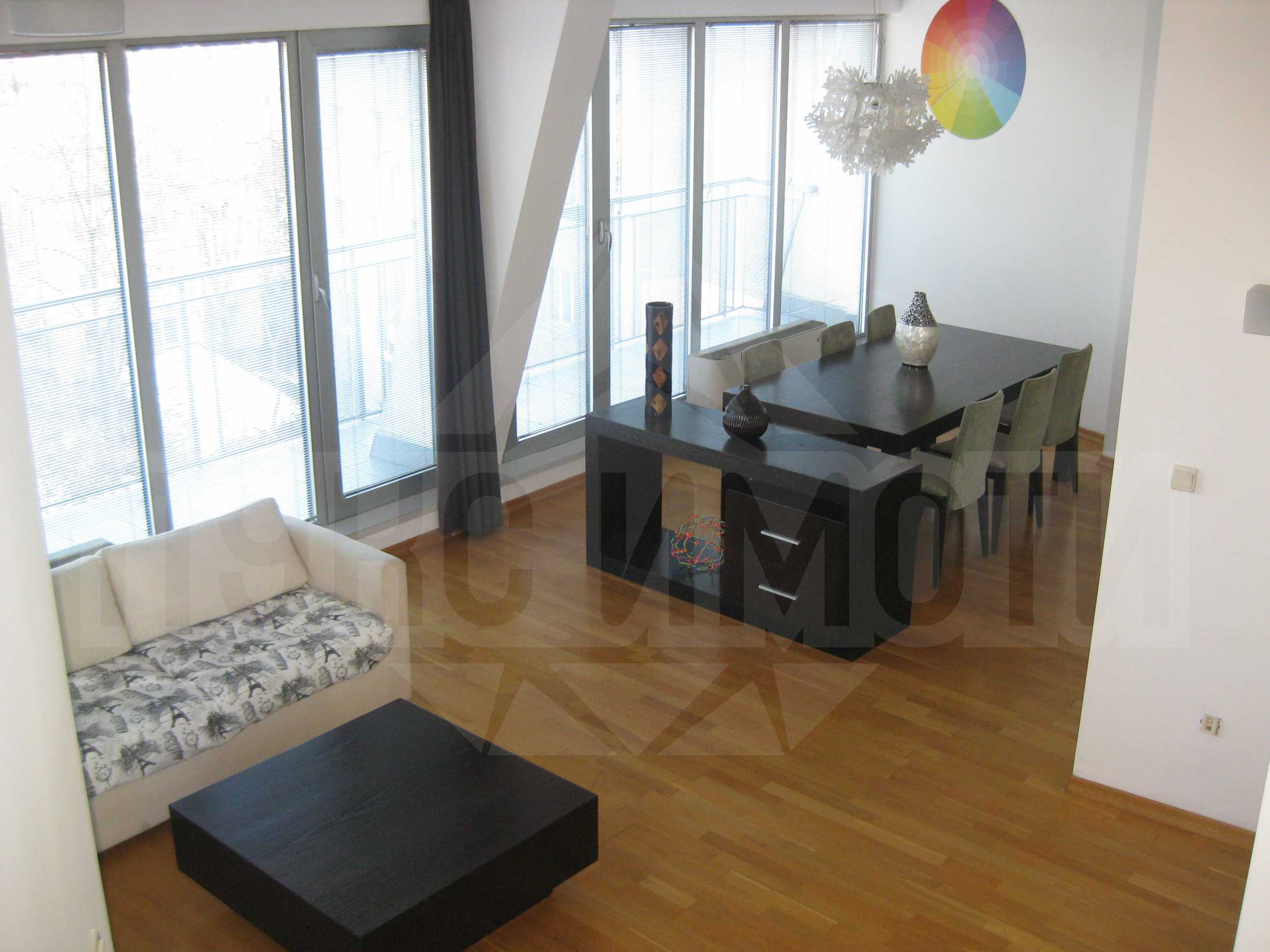 Мезонетът е с две спални и площ от 243 кв.м. Намира се на шести етаж в модерната сграда, строена през 2005 г., снабдена с асансьор. Жилището се разпределя по следния начин: голям хол с кухненски бокс и трапезария, спалня с гардеробна, баня с WC, голяма тераса по цялото протежение на хола (първо ниво) и спалня с баня и тоалетна към нея, две панорамни тераси (второ ниво). Имотът разкрива прекрасна панорама към идеалния център на София – Софийски университет, храм-паметник Александър Невски и планината Витоша. Апартаментът се отдава с подови настилки дъбов паркет, дограмата е алуминиева - SAVIO by Pininfarina, на всички прозорци са поставени вътрешни щори. Жилището е оборудвано със СОТ и видеодомофон. Апартаментът се предлага напълно обзаведен с всички необходими мебели и оборудване: вградена кухня с електроуреди - фурна, стъклокерамичен плот, пералня и аспиратор CANDY, съдомиялна и хладилник с фризер BEKO. Разполага с ТЕЦ с чилъри за отопление през зимата и охлаждане през лятото. Минимален период за наемане: 1 година.