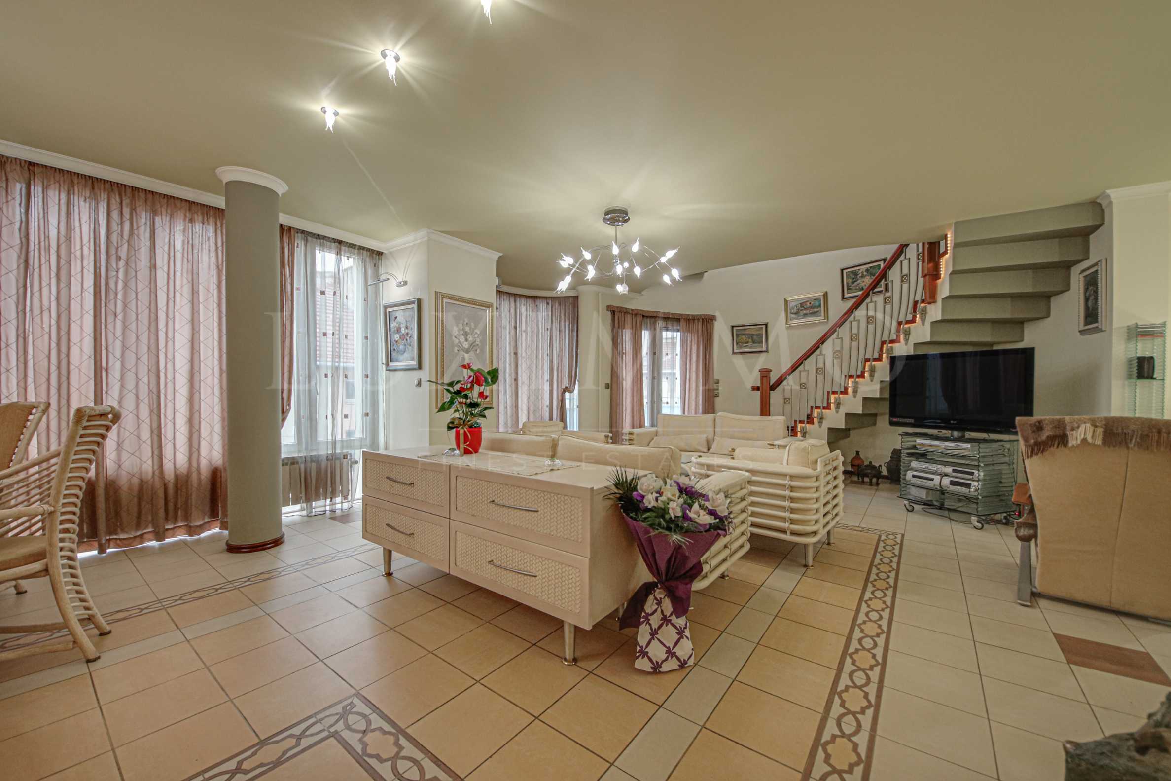 Апатртаментът е разположен на 4-тия етаж в бутикова сграда от 7 апартамента. Напълно обзаведен е по дизайнерски проект, като може да бъде сравнен с произведение на изкуството. В подкрепа на това твърдение са както парапета между двете нива – тройно пресукан от патениран метал, така и осветителните тела. Настилките в дневната са от естествени материали и са подредени като килим. В останалата част на имота е висококачествен дъбов паркет. Изложението му е югоизточно.