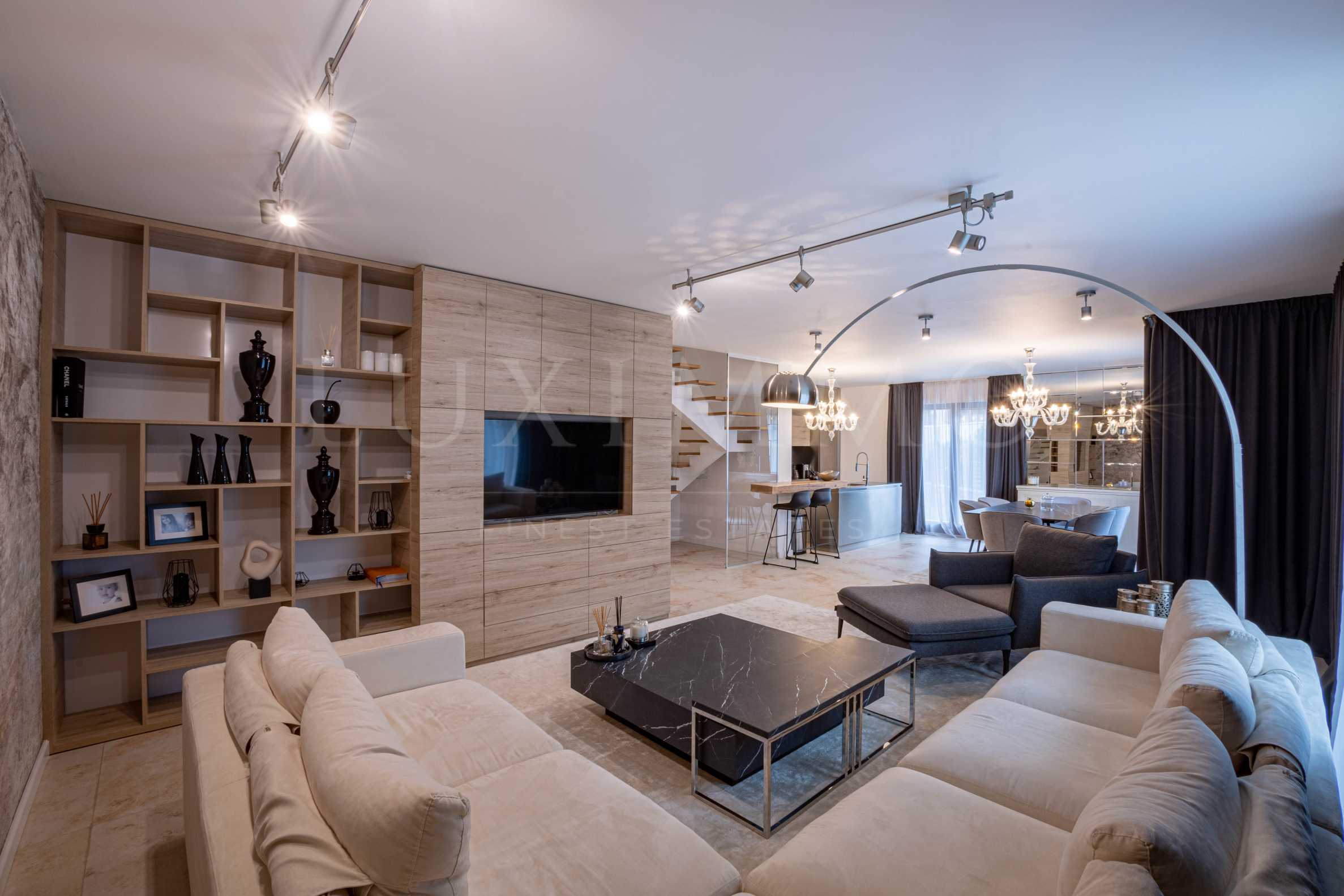 Имотът е разпределен на две нива, а собственият двор с площ 150 кв.м придава усещане за уединен живот в къща, но същевременно с бърз достъп до центъра на столица. Помещенията са просторни и светли, функционално разпределени на чиста площ от 160 кв.м.