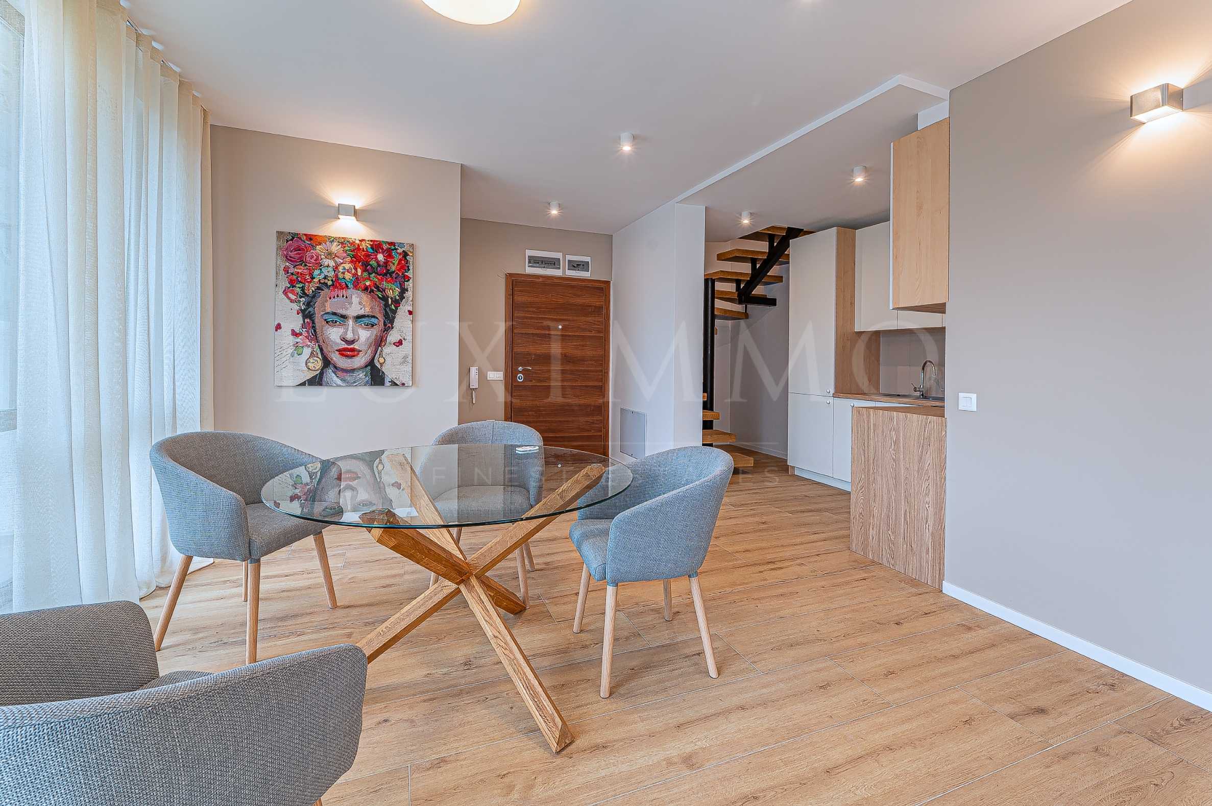 Интериор и обзавеждане:Апартаментът е чисто нов, луксозно завършен и напълно обзаведен по дизайнерски проект. Всяко помещение е внимателно планирано и изпълнено с висококачествени материали и мебели, за да се осигури максимален комфорт и естетика. Вградената кухня е оборудвана с модерни уреди от марката AEG, предоставяйки всичко необходимо за едно съвременно домакинство.