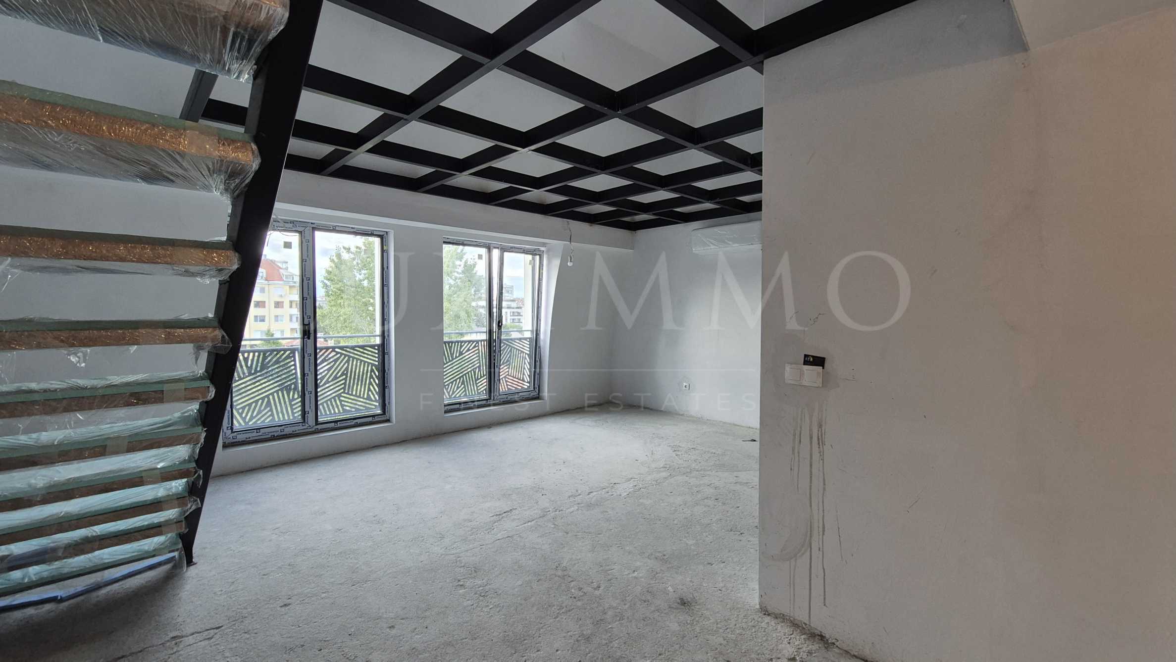 Имотът е ситуиран на 5-и и 6-и етаж и предлага 123.17 кв.м обща площ, разпределена между всекидневна с кухненски бокс, атрактивно вътрешно стълбище, две спални, баня, два балкона.