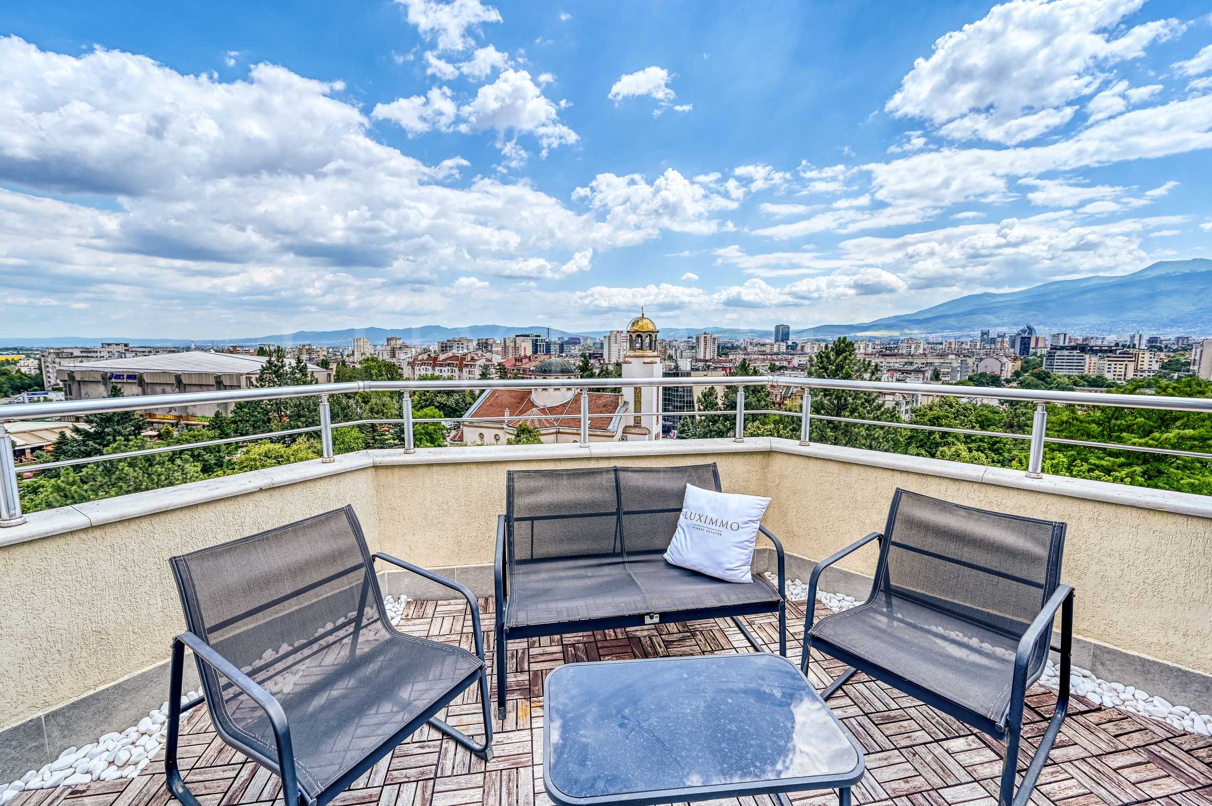 Имотът се намира непосредствено до парк „Гео Милев“ и предлага впечатляваща панорамна гледка към парка, града и планина Витоша. С обща площ от 297 кв.м, разпределена на три нива, апартаментът съчетава усещането за самостоятелна къща с всички удобства на градския живот.