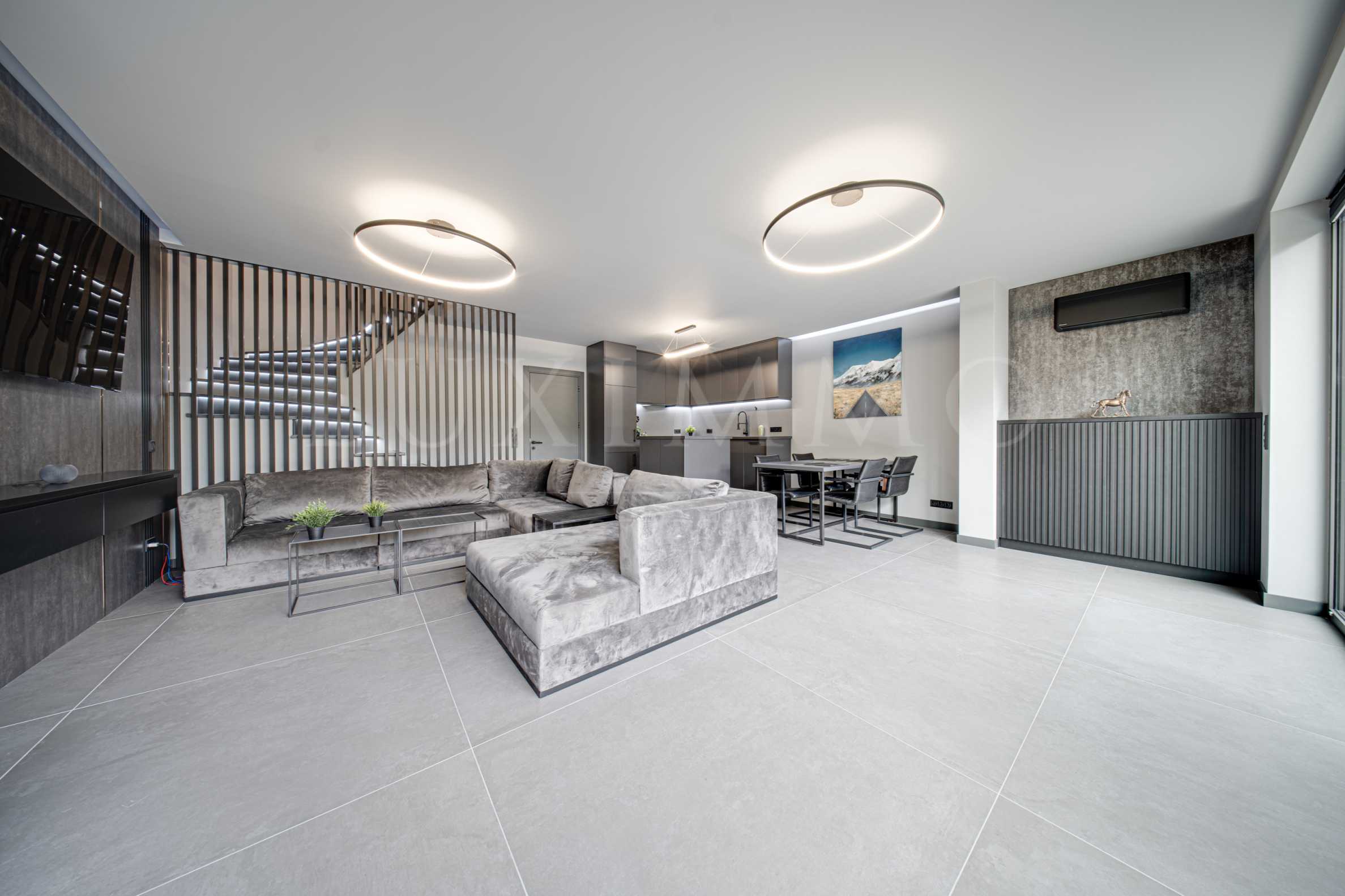 Интериорът е създаден по индивидуален дизайнерски проект с впечатляващ баланс между модерна визия и уют. Всеки детайл е подбран с прецизност, с довършителни материали от висок клас.