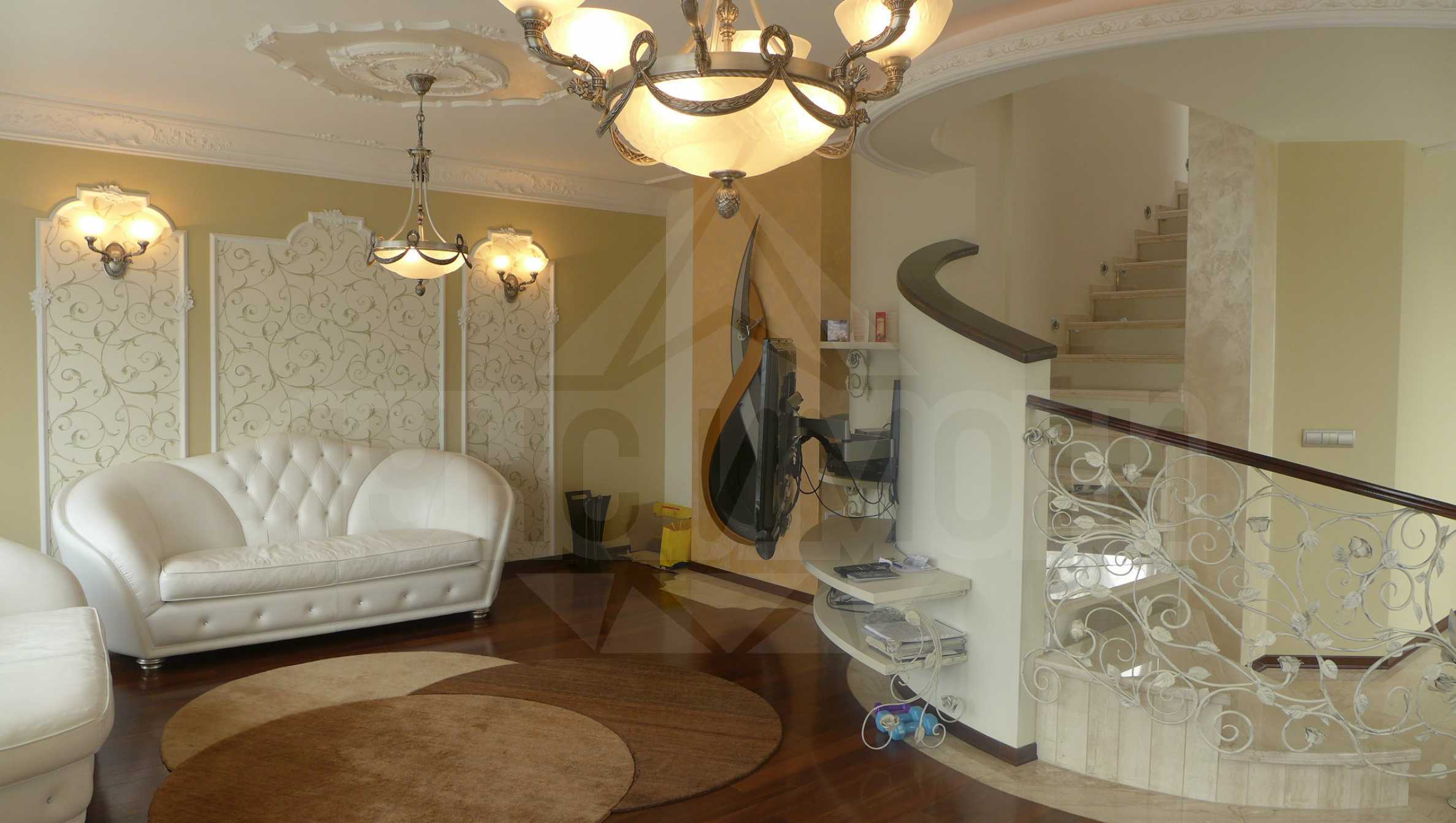 Многостайният нов апартамент (2009 година) с изложение 4-те посоки, и площ от 301 кв.м. се намира на седми етаж. Апартаментът е опасан от всички страни с тераси с панорамна гледка към Витоша и южната част на града. Имотът включва голям гараж от 35 кв.м. за две коли. Отдава се изцяло мебелиран и оборудван: кухня с необходимите кухненски уреди; дневна - мека мебел, дизайнерска камина; три детски стаи - напълно обзаведени, легла, гардероби, бюра; спалня на второ ниво със собствена баня, камина и красива гледка на юг. На първо ниво има голяма баня с тоалетна за децата, както и тоалетна за гости. Отоплението е чрез ТЕЦ и климатици. В сградата има асансьор, който спира в апартамента, но в същото време жилището има и втори вход.