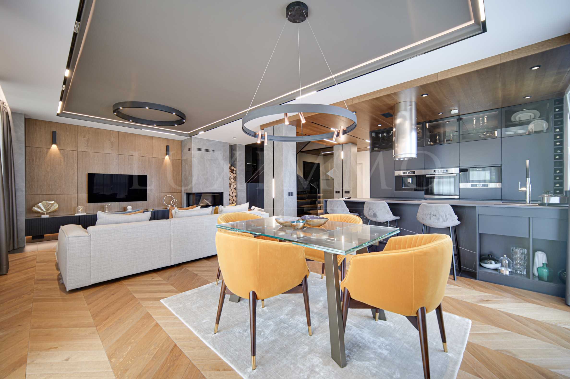 • мека мебел, ниска маса, разтегаема маса за хранене, четири стола, LED телевизор „LG”, камина; кресло