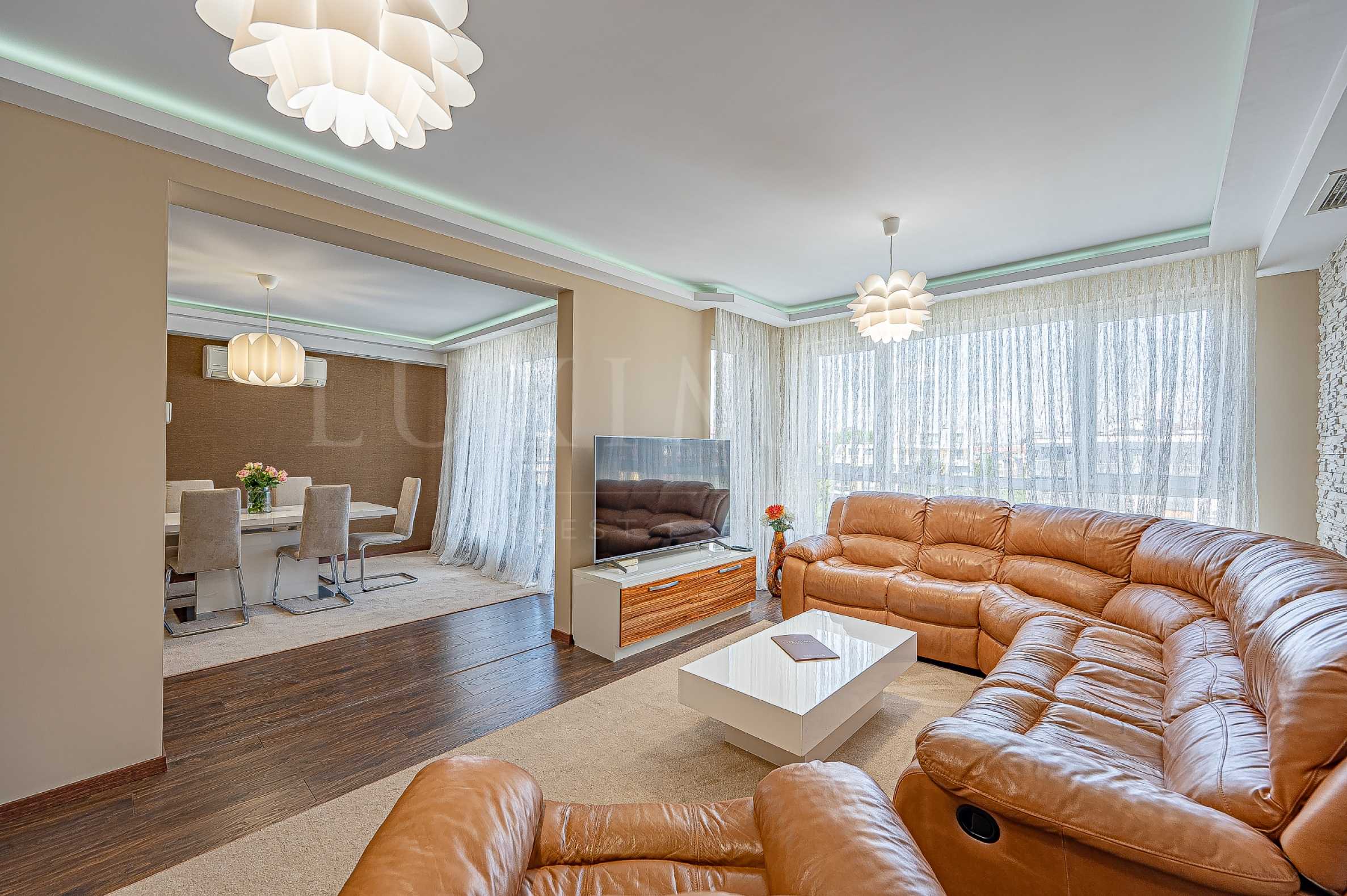 Този прекрасен и светъл апартамент представлява идеално съчетание на комфорт и стил. Разположен е на пети етаж в малка, красива сграда с ограничен достъп и портиер. Напълно обзаведен със съвременни мебели и удобства, апартаментът е готов да посрещне новите си наематели. Светлите прозорци пропускат обилна естествена светлина през целия ден, създавайки приятна и уютна атмосфера.