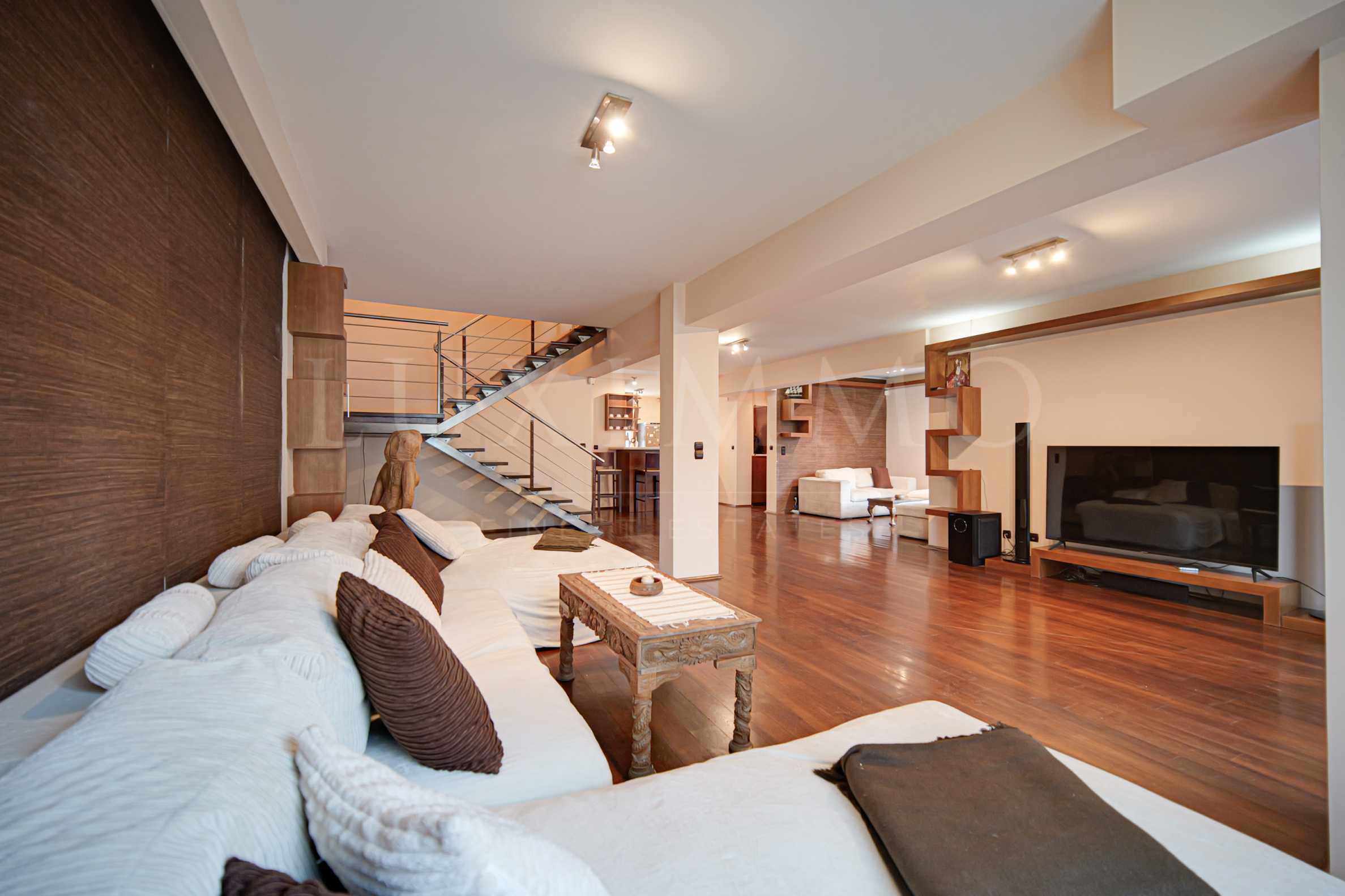 Първо ниво: Изключително просторна дневна, напълно обзаведен кухненски бокс, отделена трапезария, тераса и самостоятелна тоалетна. Настилката е от тиково дърво, а присъствието на произведения на изкуството придава на апартамента индивидуалност и изисканост. Тук семейството и гостите могат да се насладят на пространството ,което е идеално място за организиране на различни събития и семейни вечери.