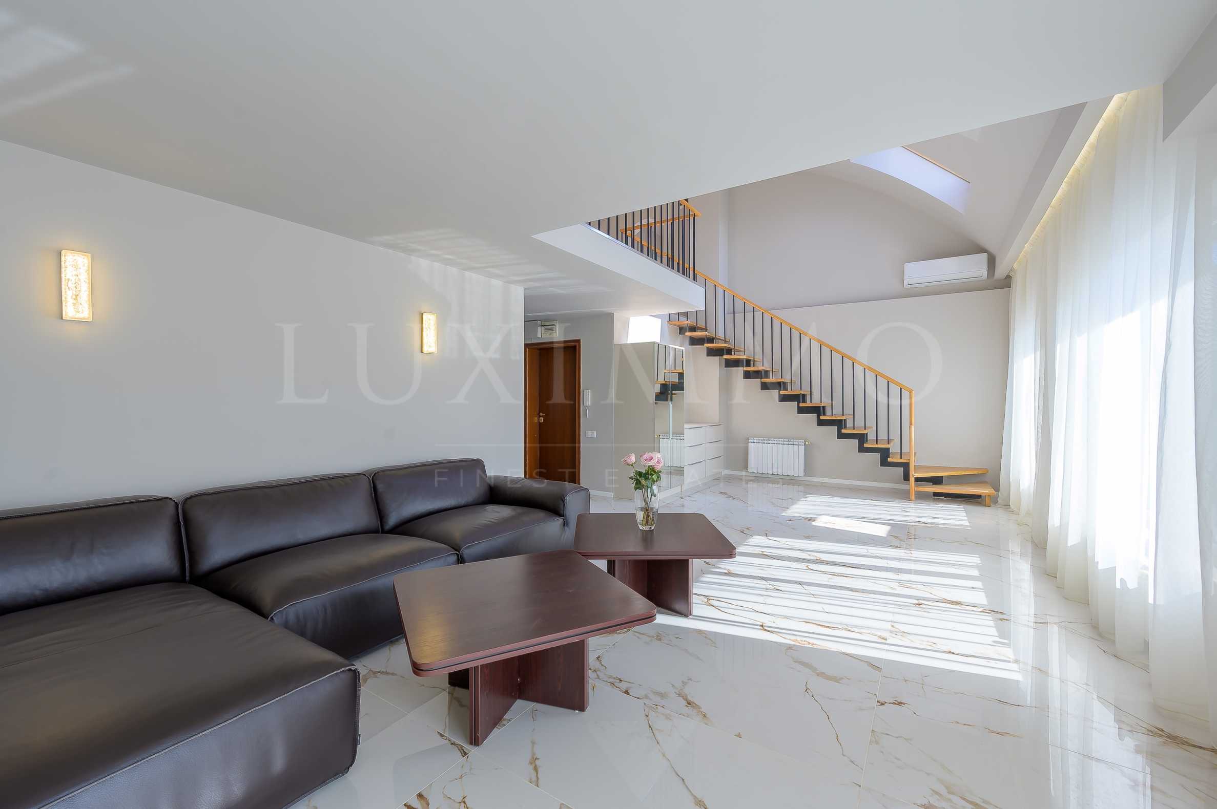 Представяме на Вашето внимание впечатляващ, чисто нов мезонет под наем, разположен в непосредствена близост до бул. България – една от най-предпочитаните и комуникативни локации в града. Имотът съчетава простор, модерна визия и функционално разпределение, създавайки усещане за комфорт и престижен начин на живот. С обща площ от 304 кв.м. жилището предлага изключително пространство и удобства, подходящи както за голямо семейство, така и за хора, които ценят уюта и свободата на просторния дом.