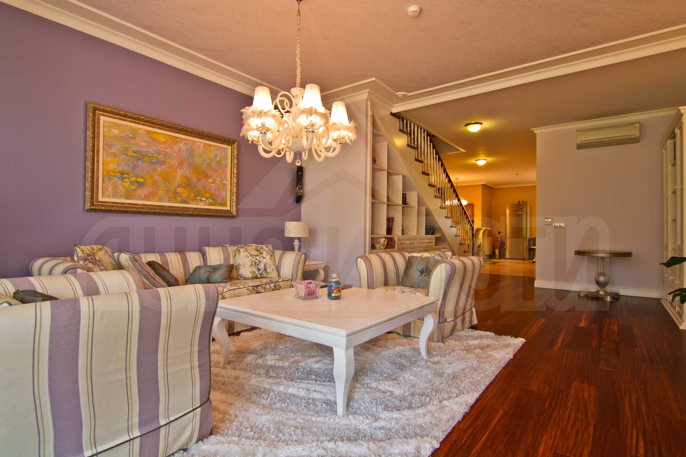Жилището е разположено на две нива- партерен и първи етаж. Изложението е юг/север. Имотът е луксозно завършен, като за целта са селектирани материали от най-висок клас.