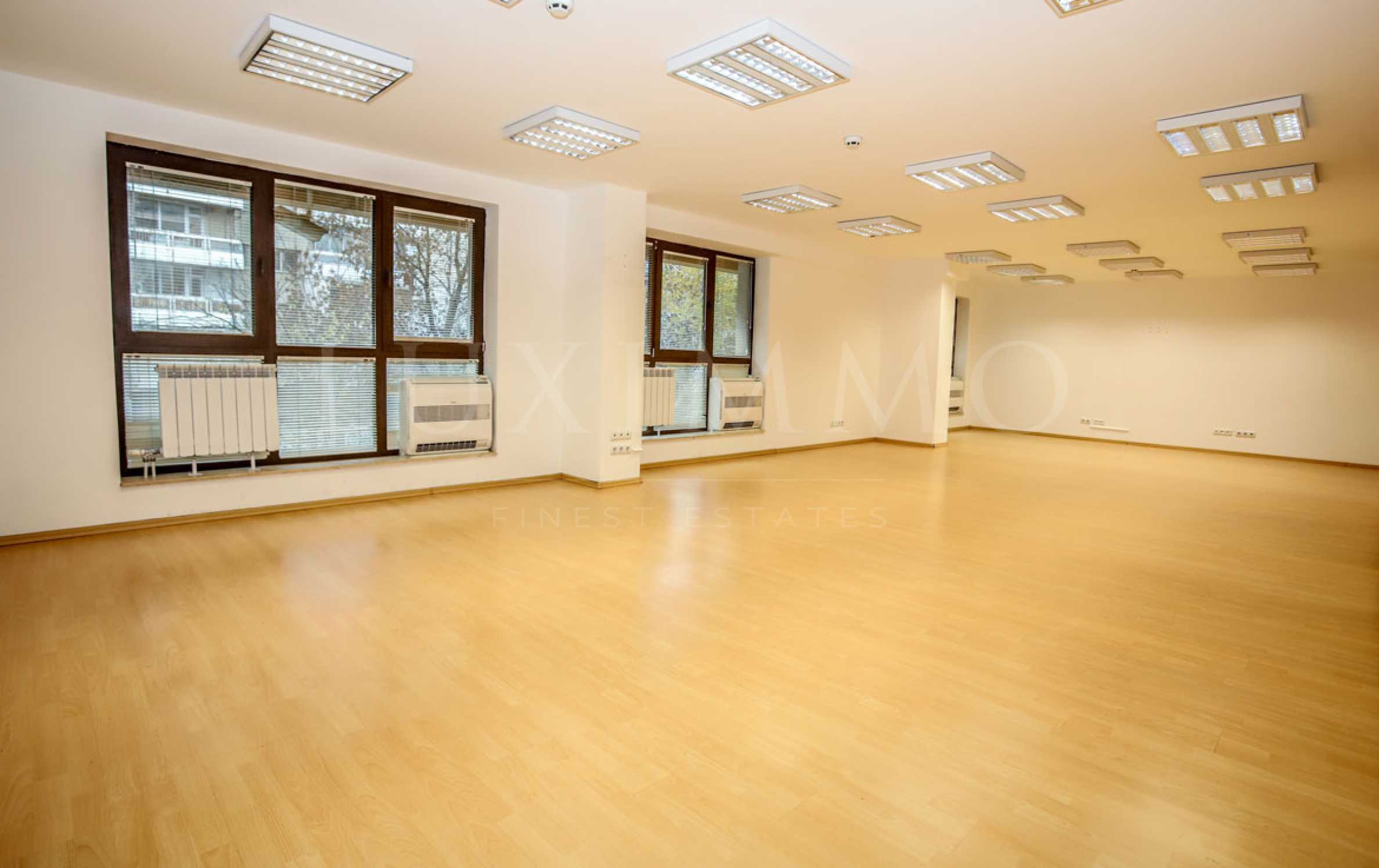 Офисът е с квадратура 144м2 състои се от: едно голямо помещение – open space, коридор, стая с кухненски бокс, кабинет, коридор, баня с тоалетна и тераса.