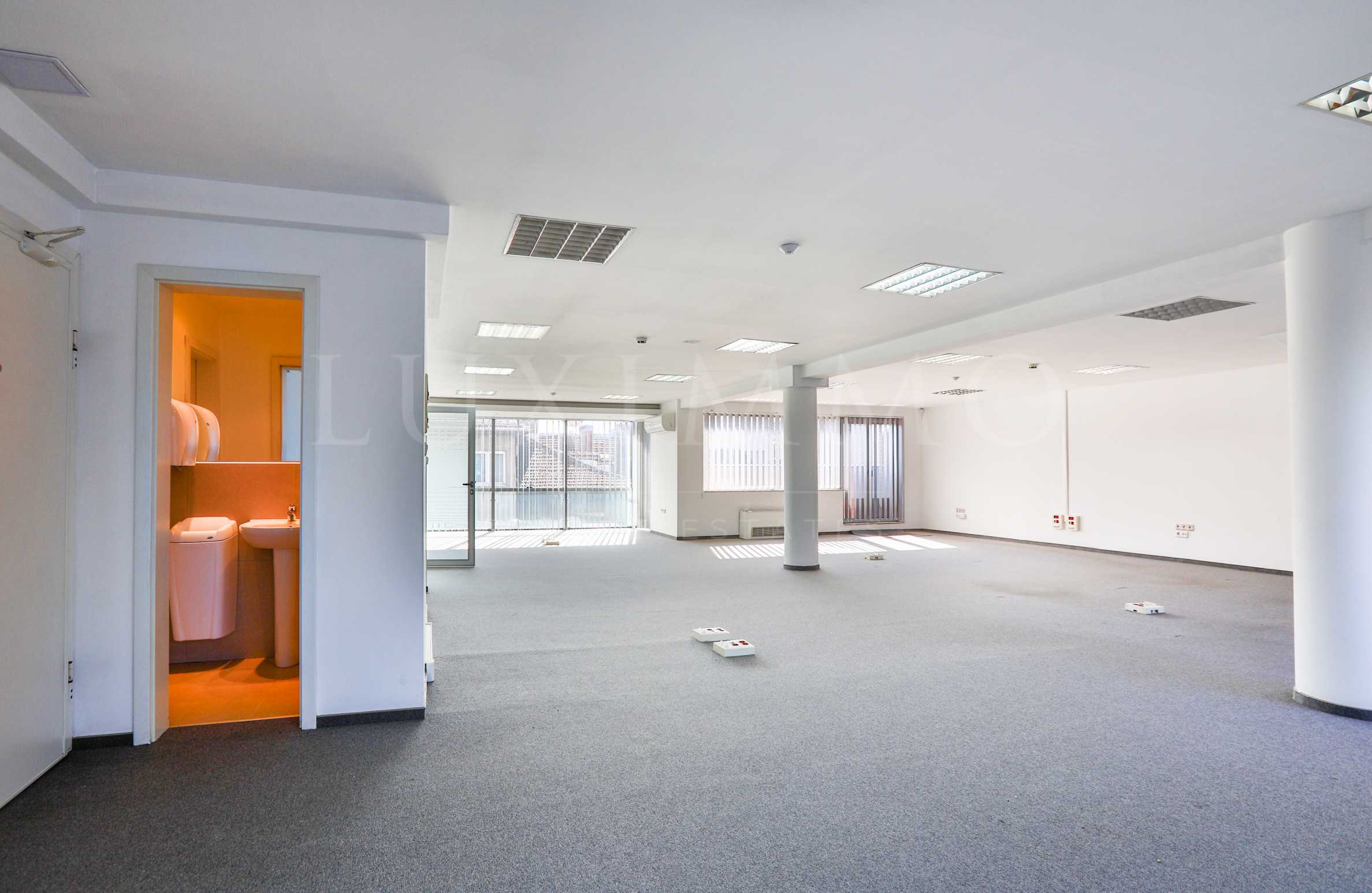 Помещението е с обща площ от 200 кв.м, като преградните стени са стъклени и има възможност за преустройство. Подовата настилка е мокет, има СОТ.