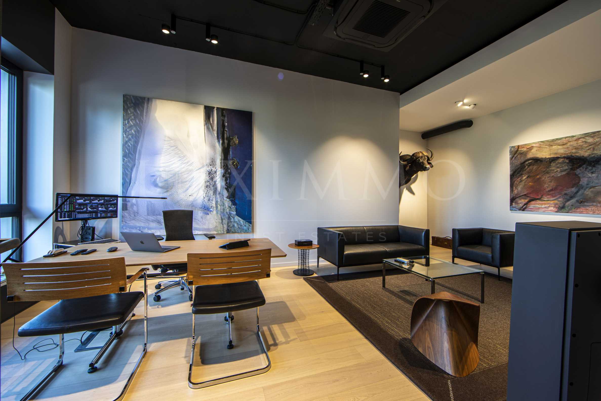Офисът се състои от две просторни помещения, с обща площ от 115,65 кв.м: първото помещение е разделено на две със стъклена преграда, следва коридор с вградена кухня и баня, основна зала с мека мебел и представително бюро за преговори. Бизнес имотът е светъл, с прозорци и атрактивно осветление. Завършен е с екстравагантен дизайн: тавани в стил лофт, стените са комбинация от бетон и боя, с графити и елегантни еклектични картини, цветовете са модерни - сиво, черно и бяло, мебелите са подбрани с класически офис акцент - удобство и пространство.