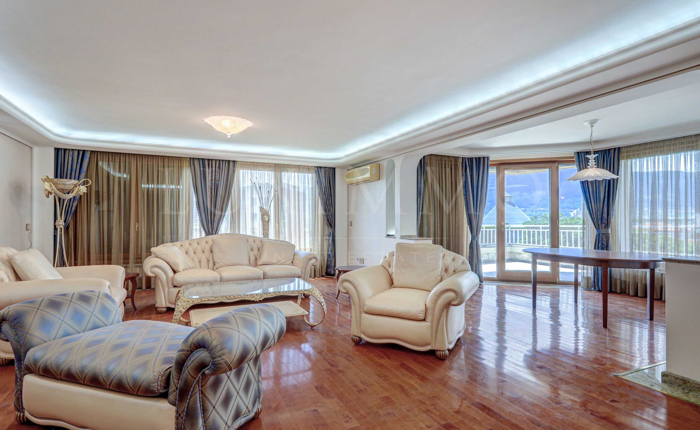 Апартаментът е изпълнен по дизайнерски проект, с впечатляващи архитектурни находки, завършен с подови настилки от най-висок клас.