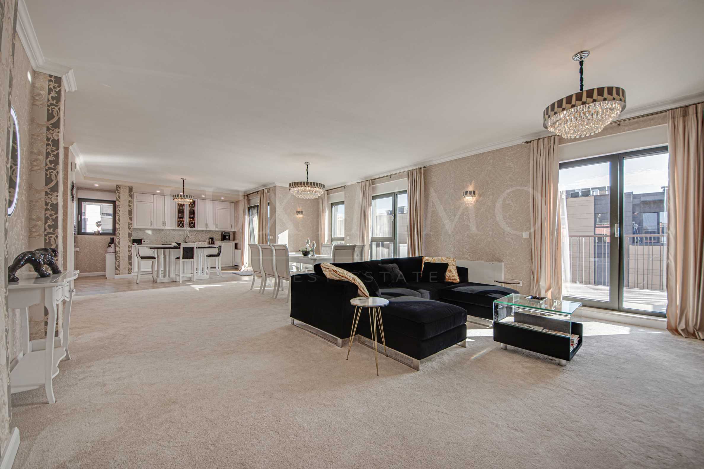 Апартаментът се предлага напълно обзаведен с висококачествени мебели и техника, част от които са кухня от масив с всички вградени електроуреди, италианска мека мебел от Frigerio, детски стаи с италианско обзавеждане от ZG, килими от естествена вълна 2 см, телевизори Sony, система за озвучаване Denon, перална машина и сушилня, завеси, скринове, шкафове и др.