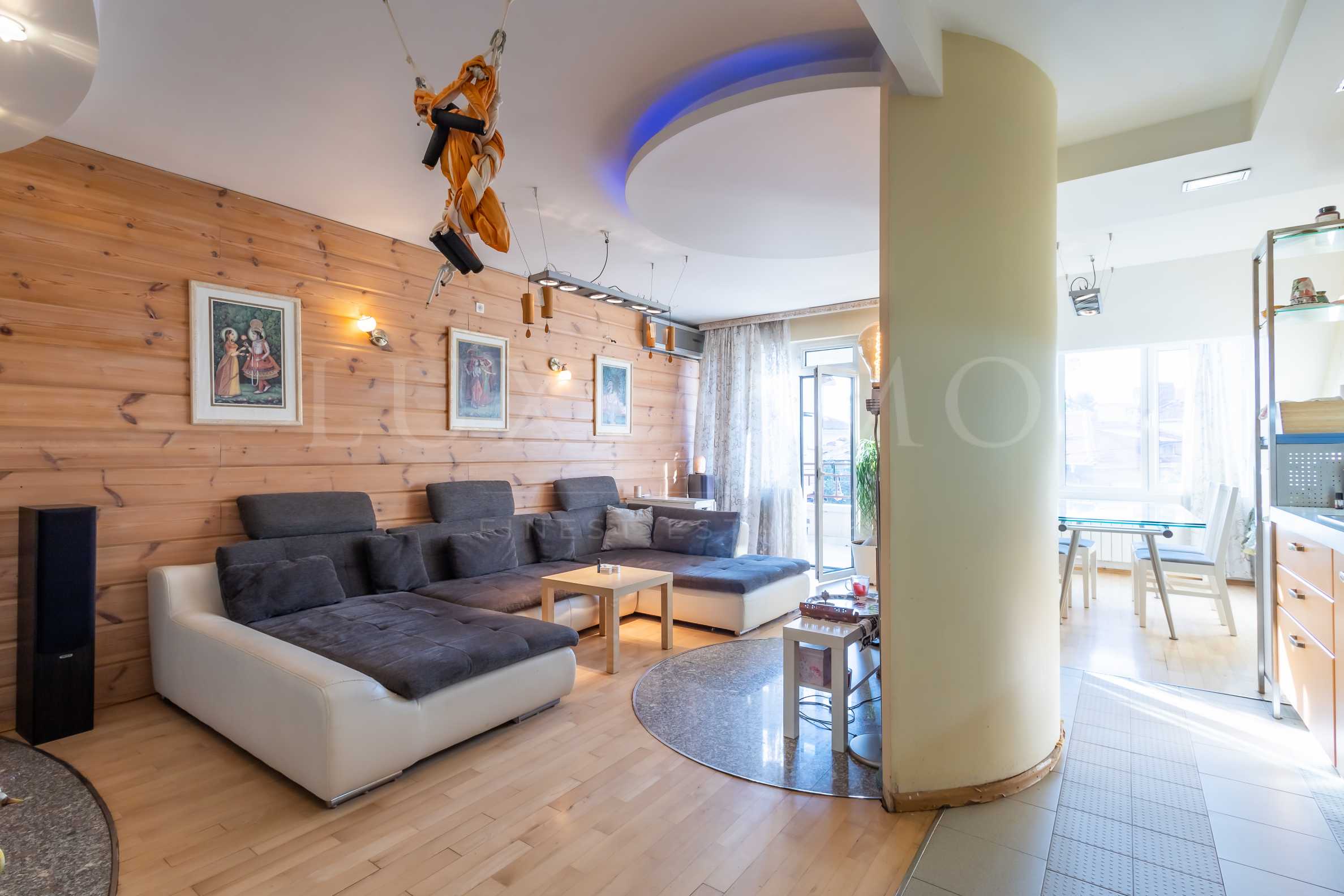 Жилището се предлага обзаведено и оборудвано, стълбите са от гранит. Отоплението е централно парно, съвременна абонатна станция (апартаментът е вътрешен за кооперацията). Има климатици във всяка стая, както и камина на дърва с въздушна риза във всекидневната.