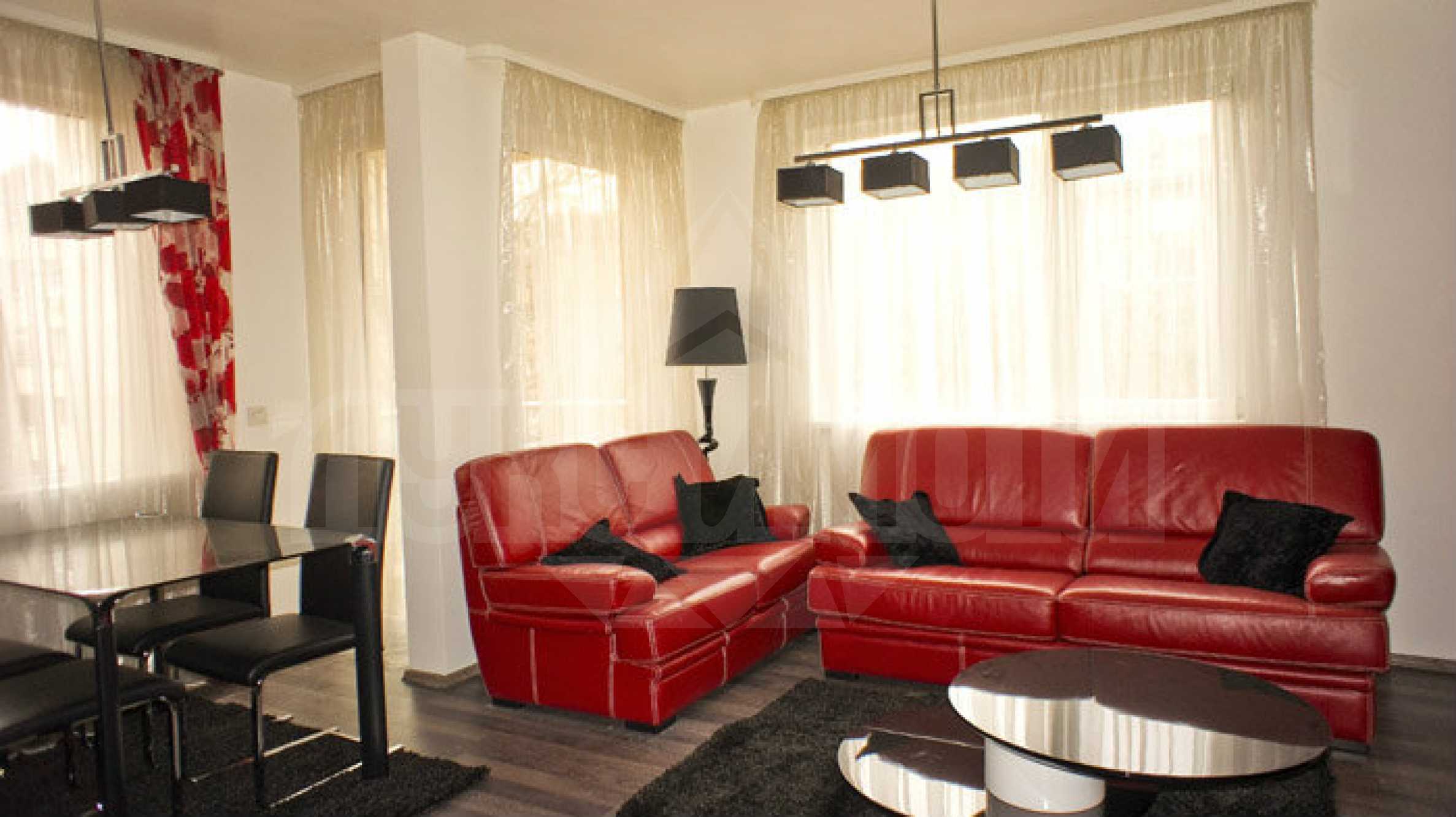 Апартаментът е напълно обзаведен. Кухнята е оборудвана с пералня/сушилня, миялна машина, ел. печка с керамични котлони и хладилник с фризер. Цялото обзавеждане и оборудване е в отлично състояние.