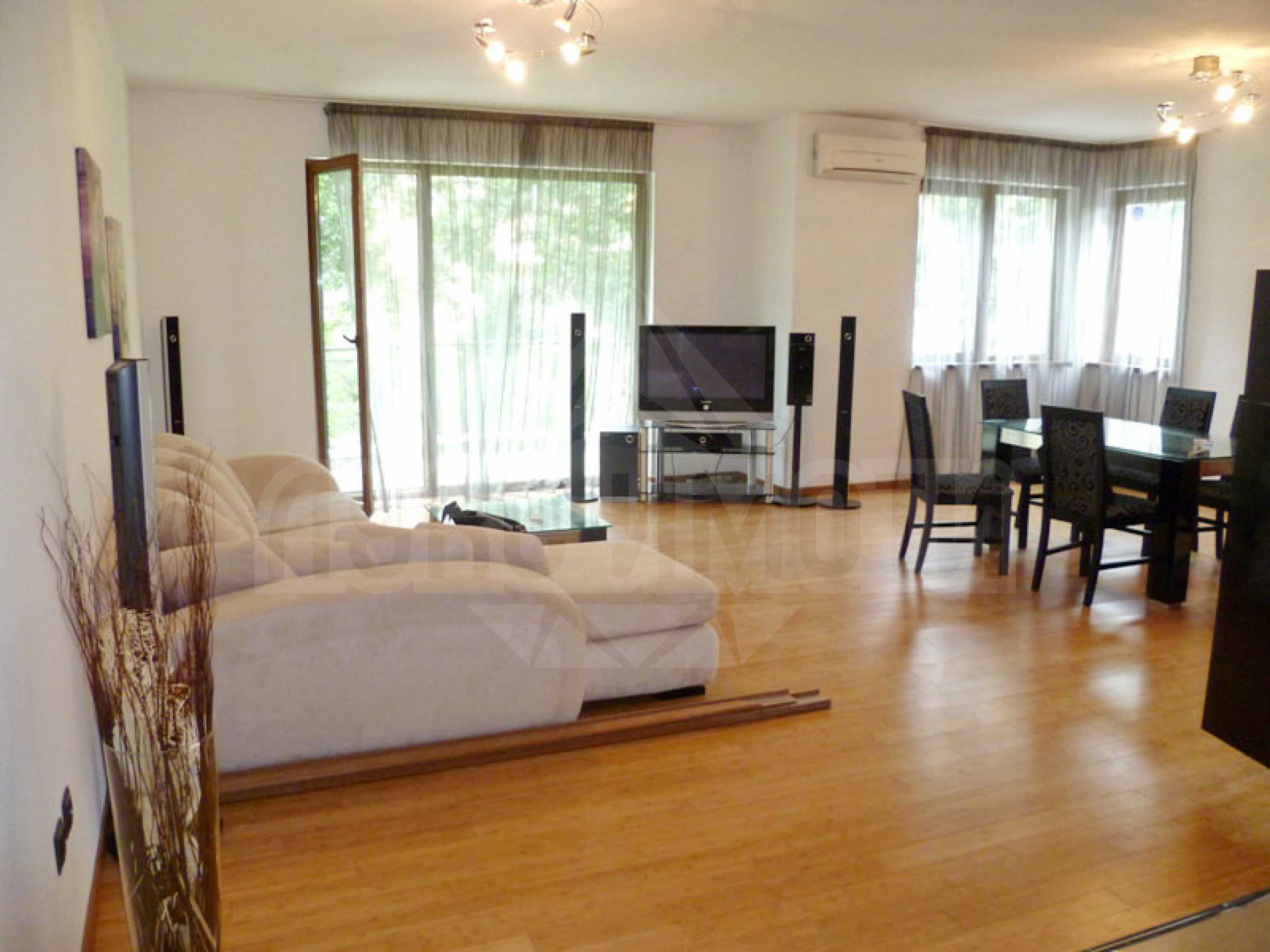 Дневната е обзаведена с мека мебел, холна маса, маса за хранене със столове, система за домашно кино „Samsung” и LCD TV „Samsung”. Кухненският бокс е оборудван с всички необходими вградени кухненски уреди – пералня „Samsung”, хладилник с камера - „Eurolux”, фурна и съдомиялна „Electrolux”, керамичен плот и аспиратор „Conegliano” . Едната спалня е с двойно легло и гардероб, докато другата е необзаведена.