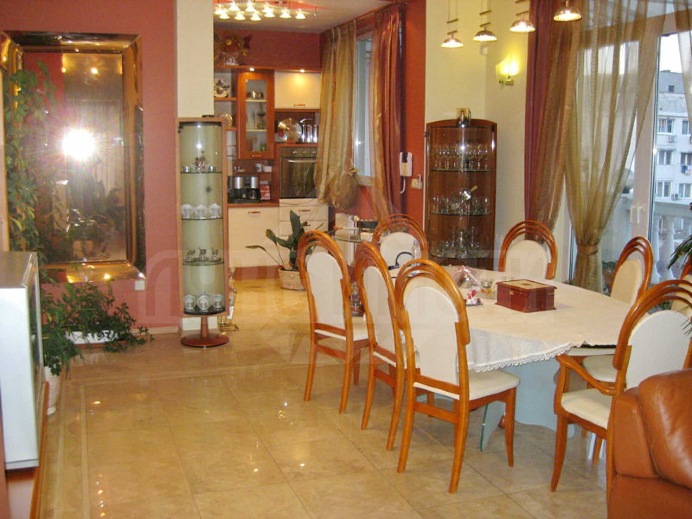 Апартаментът е разположен на 4-ти етаж в тухлена сграда (2003г.) с асансьор. Сградата има 24-часова жива охрана и отлично поддържан вътрешен двор с покрито барбекю и детски кът. Изложението е югоизток (хол) и запад (спални).