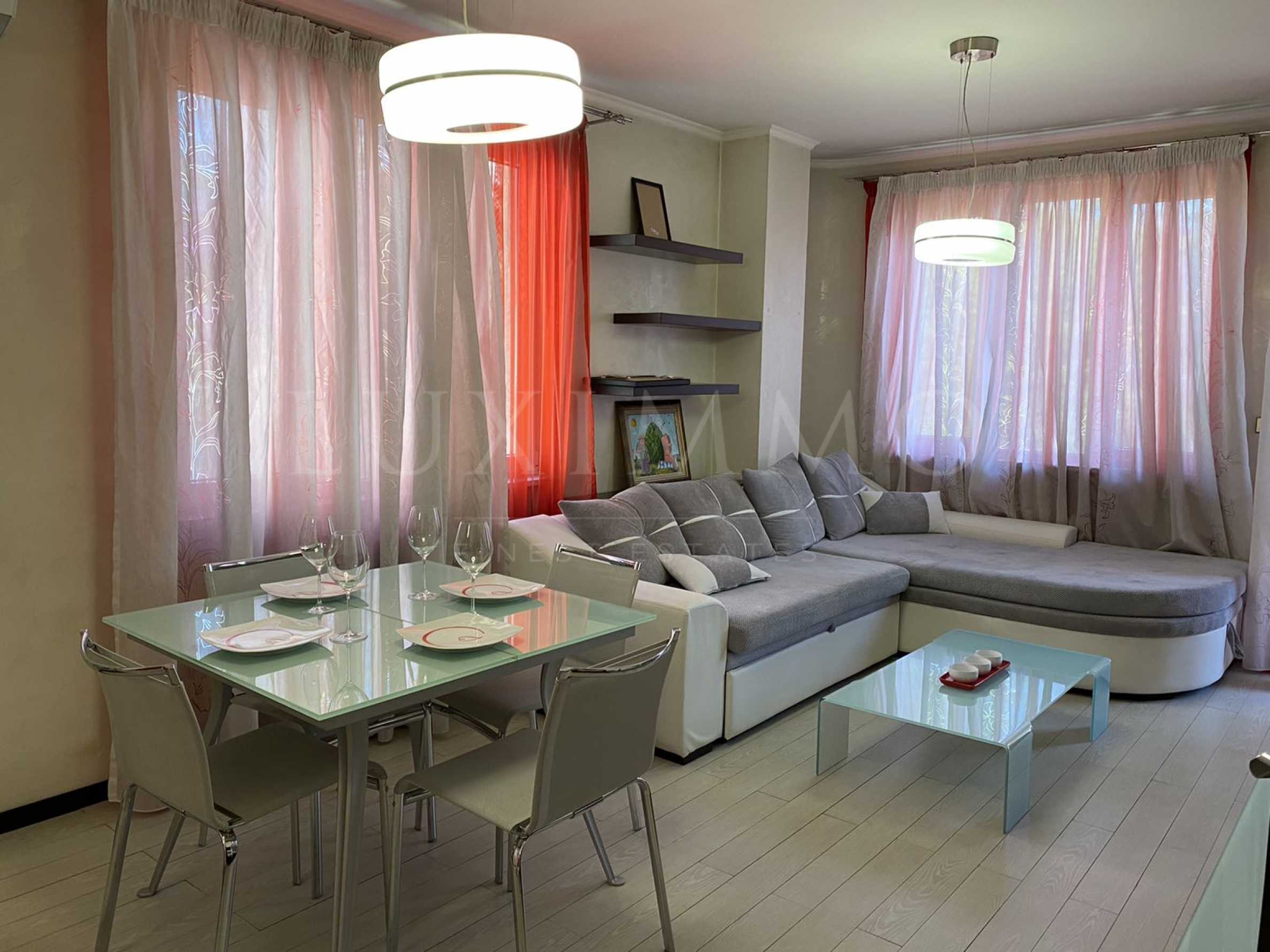 Предимства на имота: Престижен район с отлична инфраструктура; Нова сграда; Цялостно обзавеждане и оборудване; Подземен гараж, включен в цената;