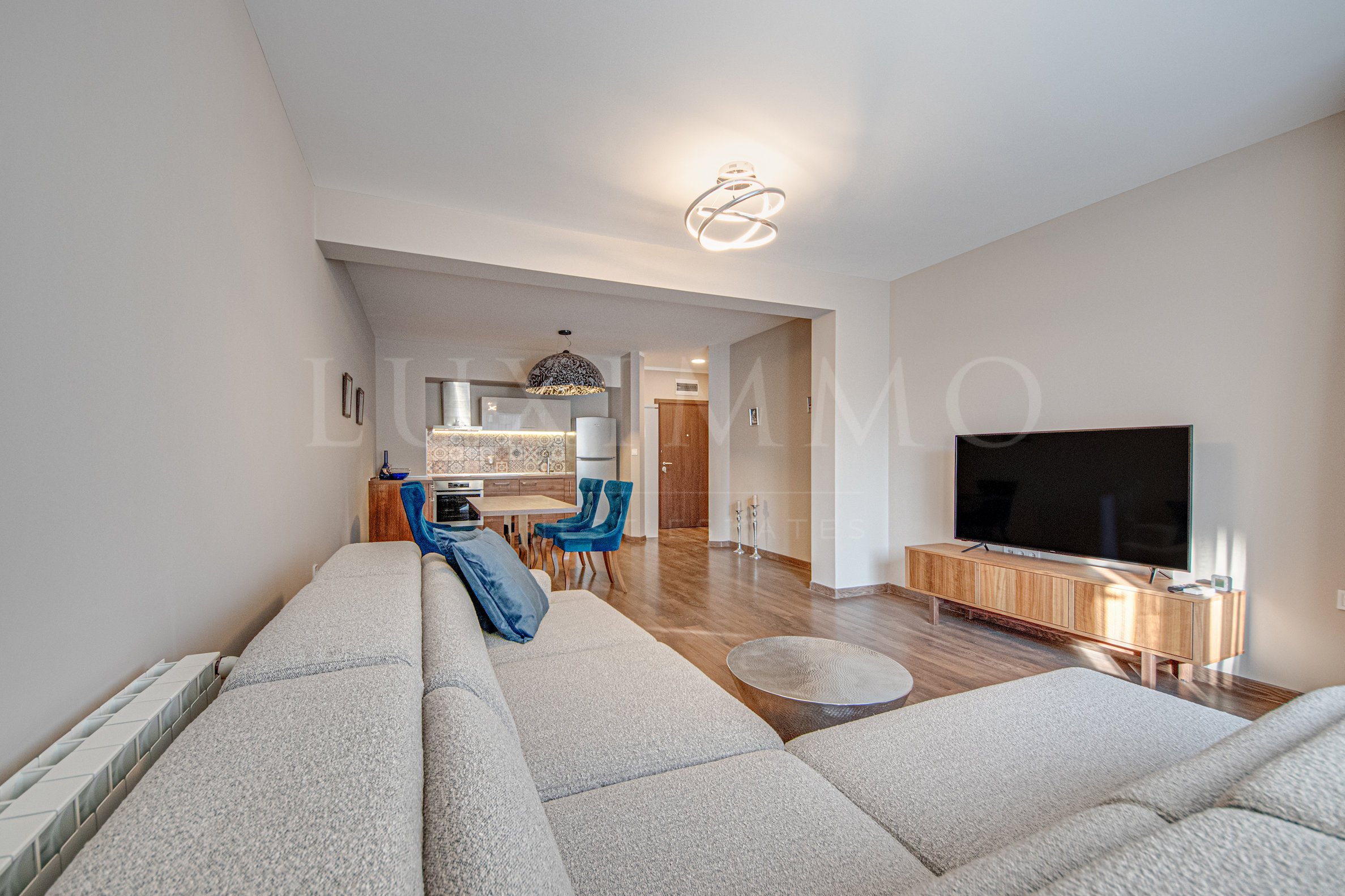 Апартаментът е обзаведен с много внимание към всеки детайл, което предлага пълен комфорт на бъдещите наематели. Светлина и уют ще Ви посрещнат във всяко помещение. Интериорът е модерен и изчистен. Решен е в пастелни нюанси, с преобладаващи акценти в синьо, които носят послание за релакс .