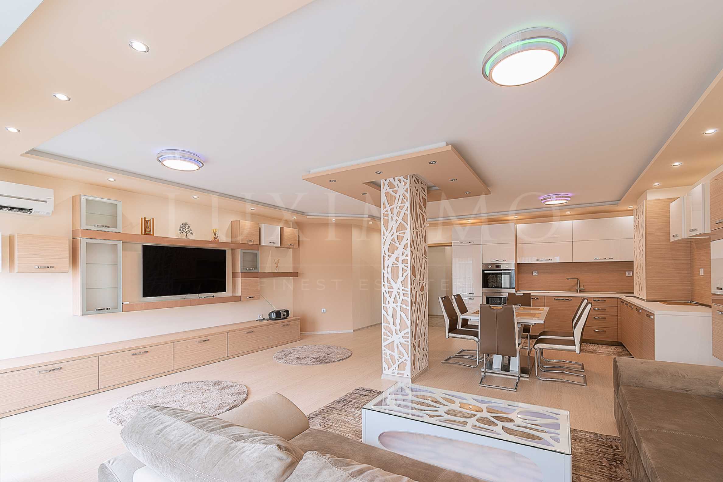 Самият апартамент се състои от входно антре, коридор, просторна и светла всекидневна с кухненски бокс и трапезария, две спални, две бани с тоалетни и тераса към всекидневната. Жилището се отличава с превъзходно обзавеждане, топли интериорни тонове и просторни помещения.