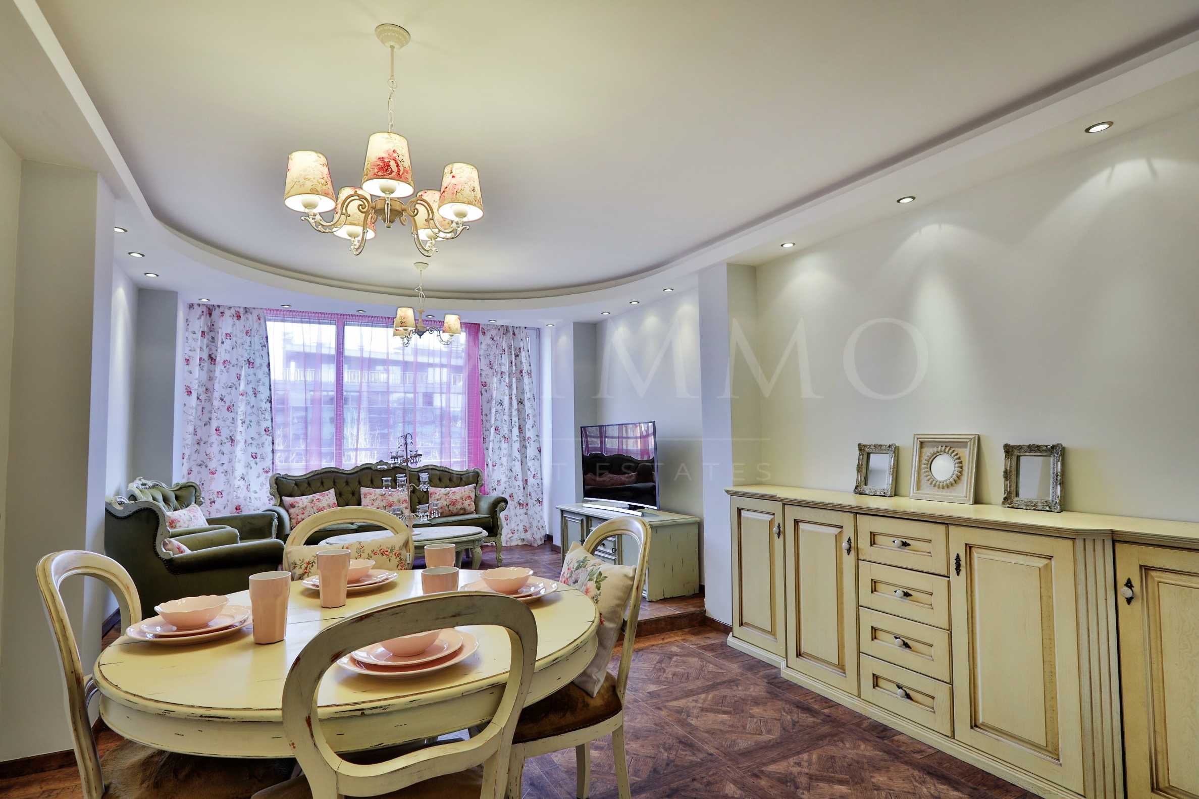 Имотът е светъл и просторен с красиви гледки към Витоша планина. Състои се от входно антре с вградени гардероби, хол с напълно оборудван кухненски бокс, две тихи спални, гледащи към вътрешен двор, баня с тоалетна, две тераси и мокро помещение. Намира се на 5-ти етаж в нова тухлена сграда, отоплението е на ТЕЦ. За удобство на бъдещите наематели към имота има и паркомясто.