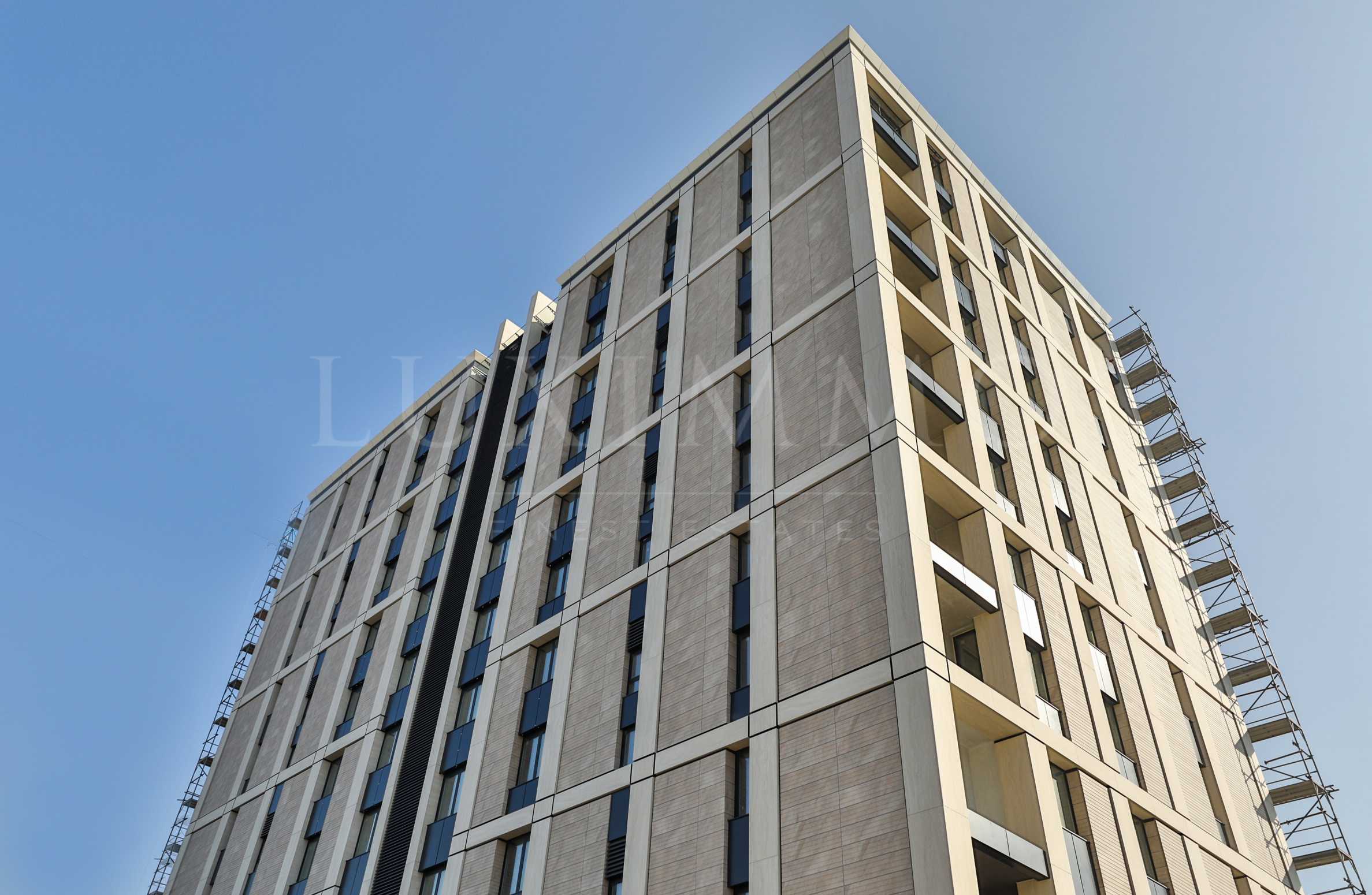 За съвременната визия на фасадата са използвани висококачествени широкоформатни стъклокерамични плочи Laminam, фасадна керамика Agrob Buchtal и система за невидим монтаж на фасадни материали Innotec.