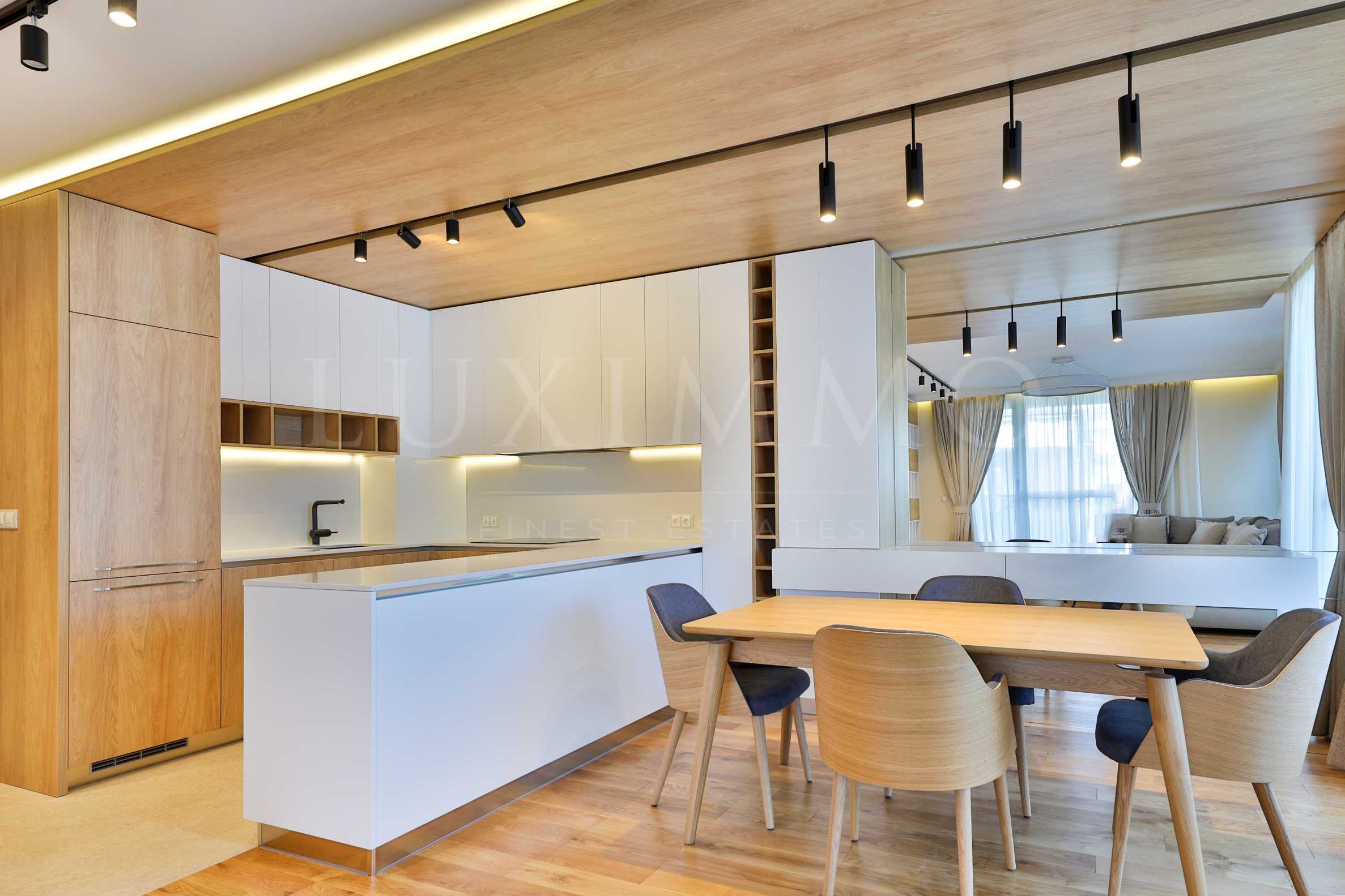 Жилището предлага комфорт и уют, с модерен дизайн: кухнята е напълно обзаведена, всички уреди са Bosch, мивка Blanco, пералня и сушилня Bosch; подовите настилки са изцяло от естествен паркет; поръчкови MDF мебели.